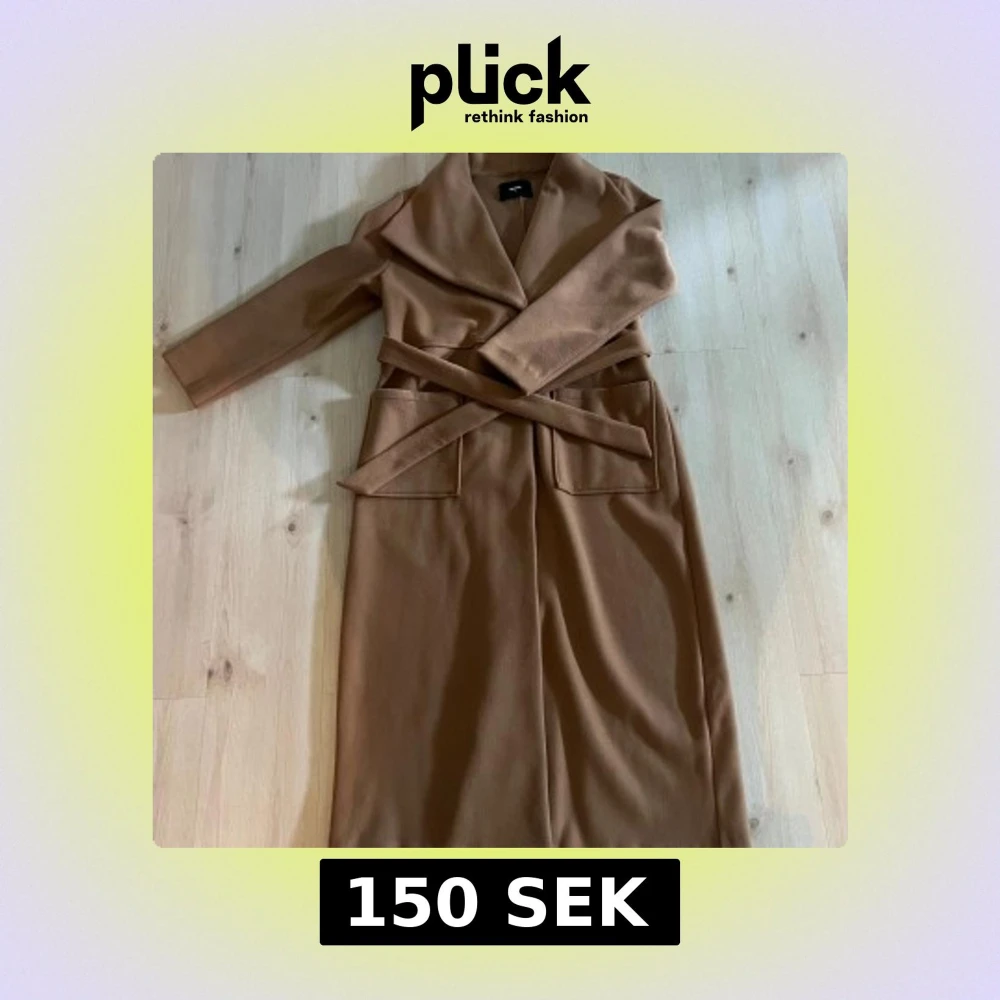 Snygg kamelbrun kappa från Bik Bok i storlek M. Lång modell med bred krage, stora fickor och bälte i midjan. Perfekt för höst och vinter, tillverkad i mjukt material som känns lyxigt. Klassisk och stilren look.