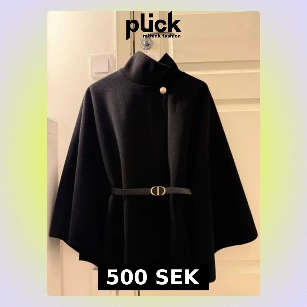 Stilren svart cape-kappa från Chelsea med hög krage och elegant bälte i midjan med gulddetalj. Kappan har en knapp framtill och ett svepande, löst fall som ger en cool siluett. Perfekt för dig som vill ha en trendig look.