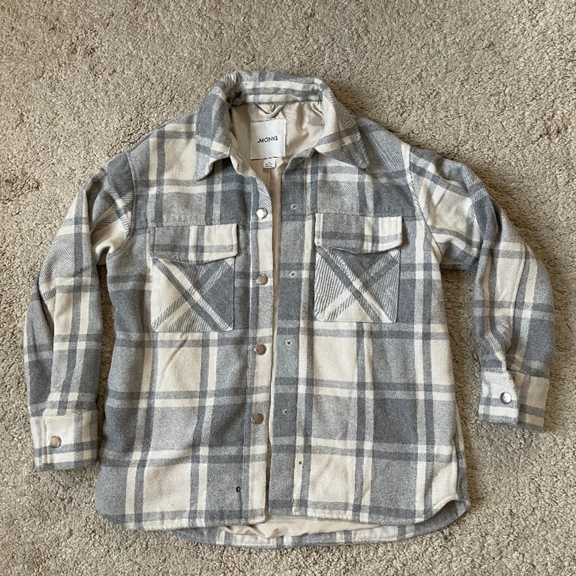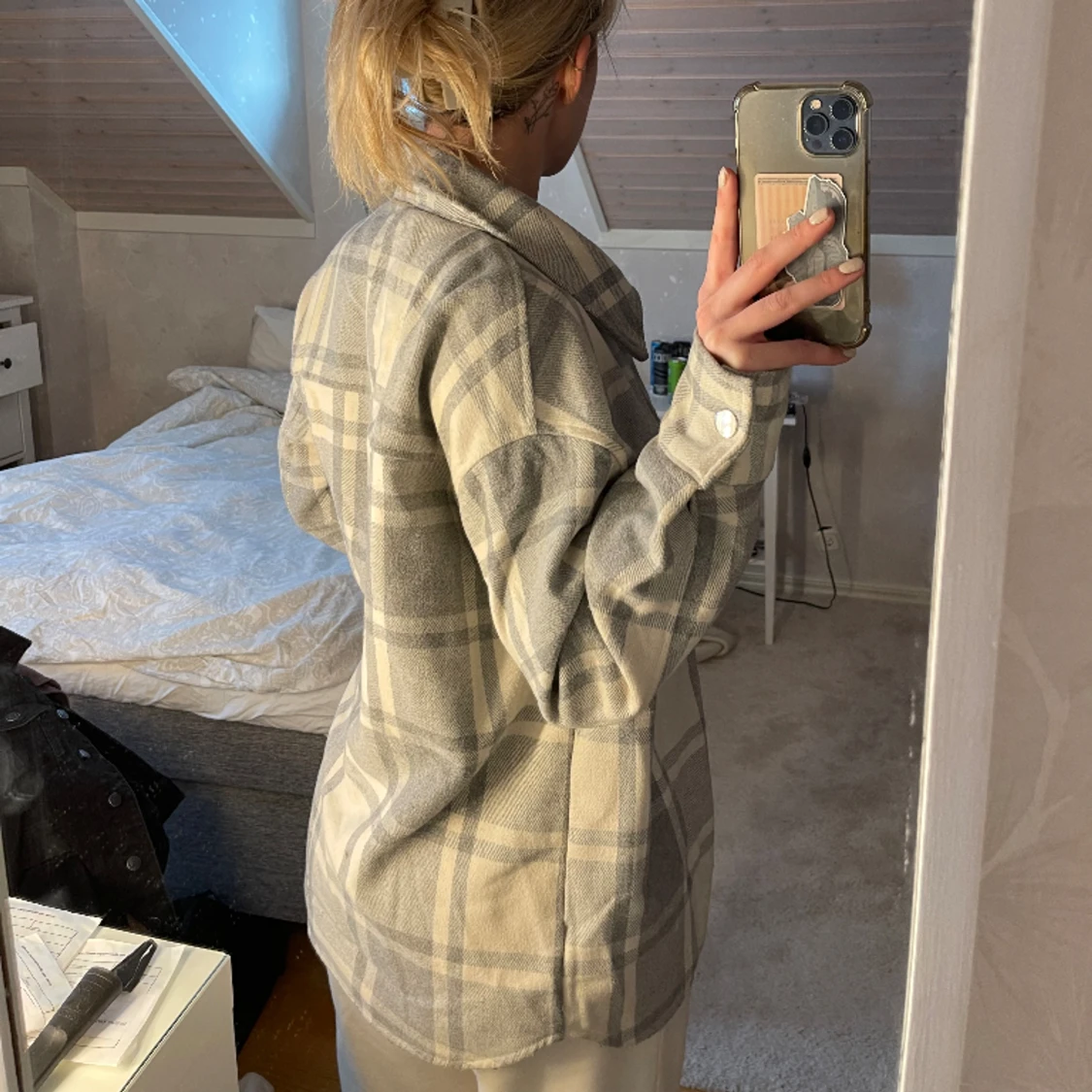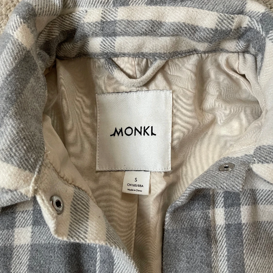 En grå rutig kappa från monki! Välanvänd kappa men fortfarande i relativt fint skick🤍den har två brännmärken på sig, skickar mer bilder vid intresse!
