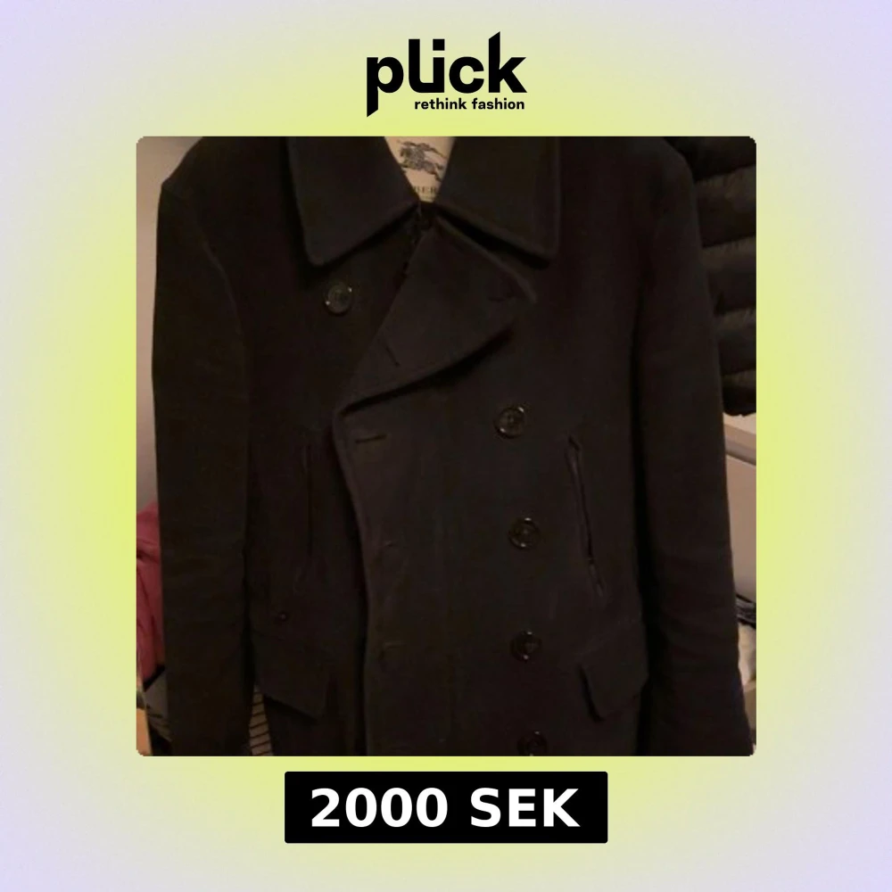Säljer en stilren svart/mörkblå rock från Burberry. Rocken har en klassisk design med knappar framtill och en elegant krage. Perfekt för att hålla stilen i kyligare väder . Säljer för att jag har tyvärr växt ur den, den passar väldigt bra om man inte är så bred i axlarna