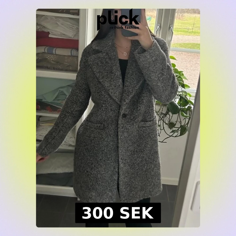 Snygg grå kappa med bred krage och en knapp framtill. Jackan har en mjuk, lite fluffig struktur och två fickor på sidorna. Finns även innerfoder i jackan så man håller sig varm även på vintern