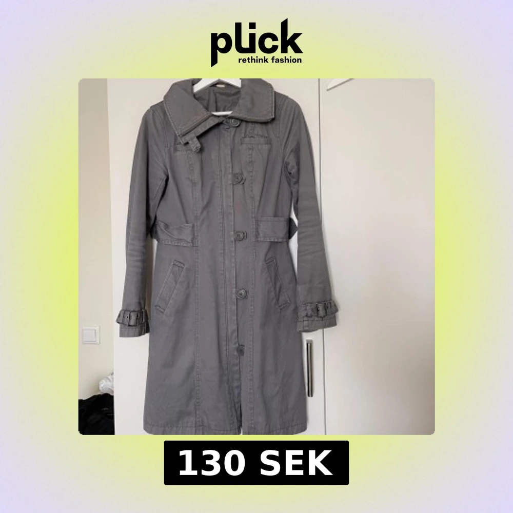 Snygg grå trenchcoat med stora knappar och bältdetaljer vid ärmsluten. Jackan har klassisk krage, två fickor framtill och markerad midja. Perfekt för dig som gillar stilrena och tidlösa plagg. Långärmad och i mjukt bomullsmaterial.