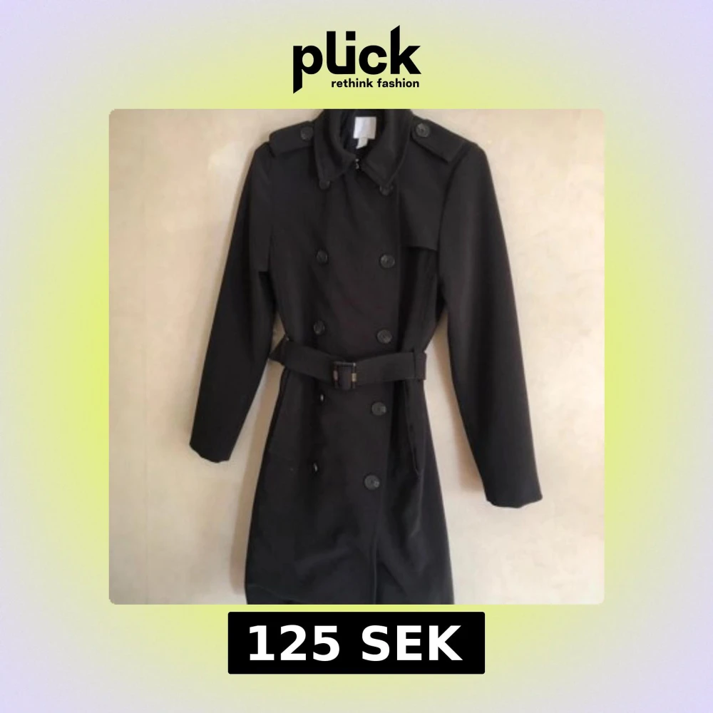 Snygg svart trenchcoat från H&M med klassisk dubbelknäppning och bälte i midjan. Perfekt för höst och vår. Jackan har långa ärmar och en stilren krage.