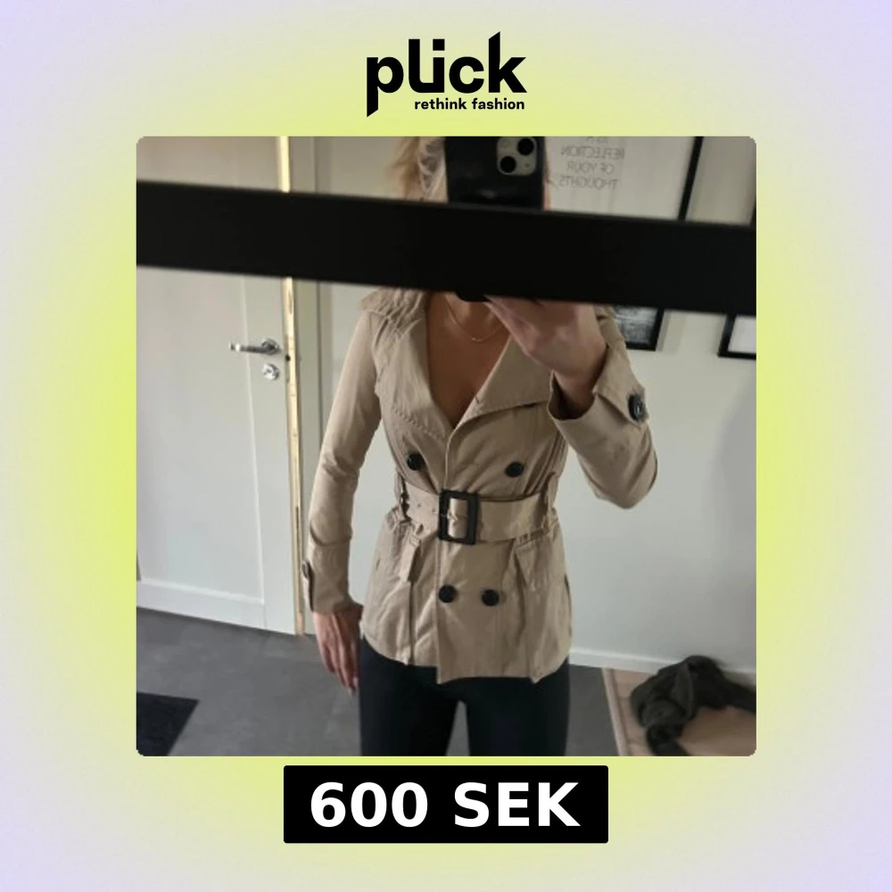 Snygg beige trenchcoat från Zara Woman med klassisk dubbelknäppning, stor krage och bälte i midjan med stor spänne. Jackan har långa ärmar, fickor med lock och svarta knappar som kontrast. Ny utan prislapp.