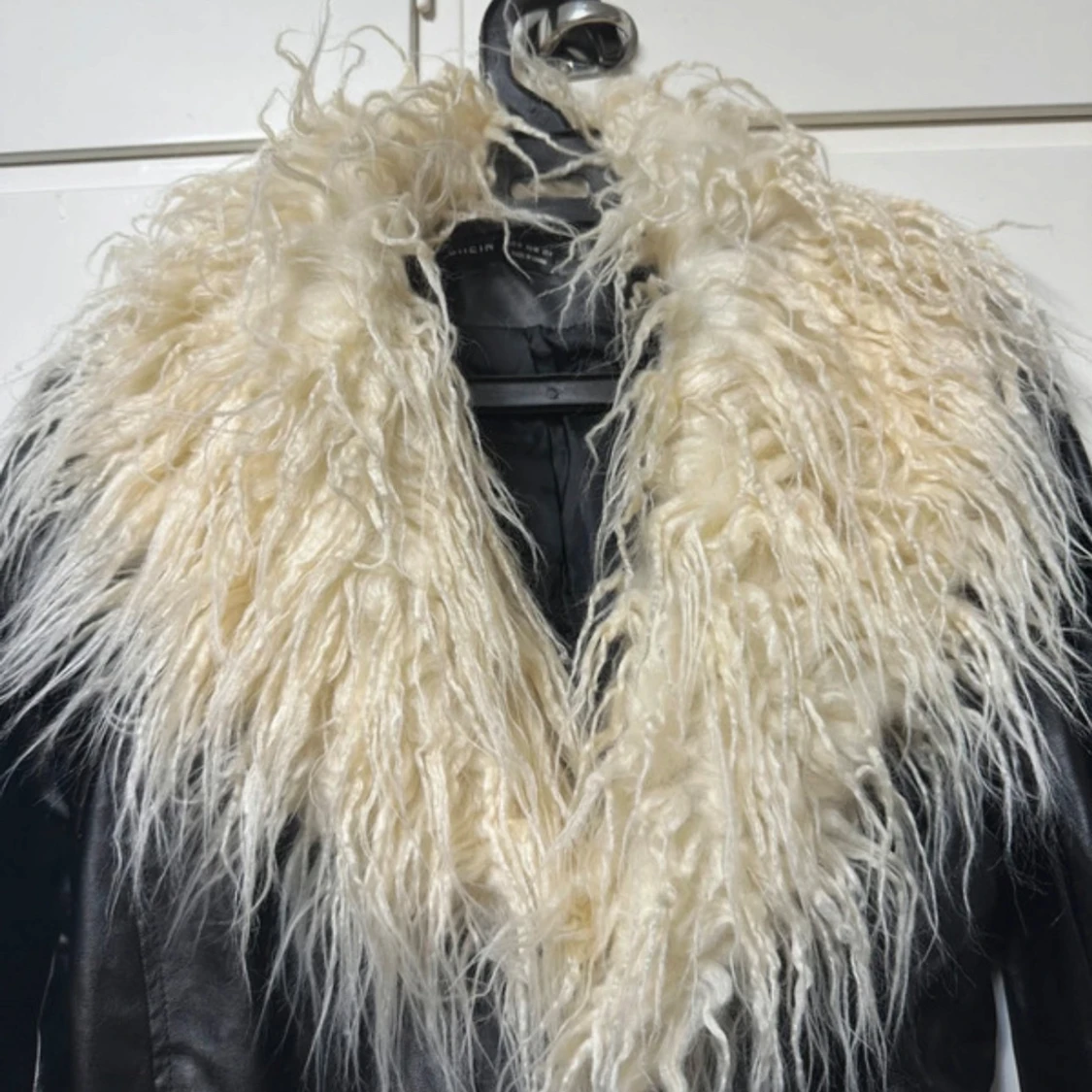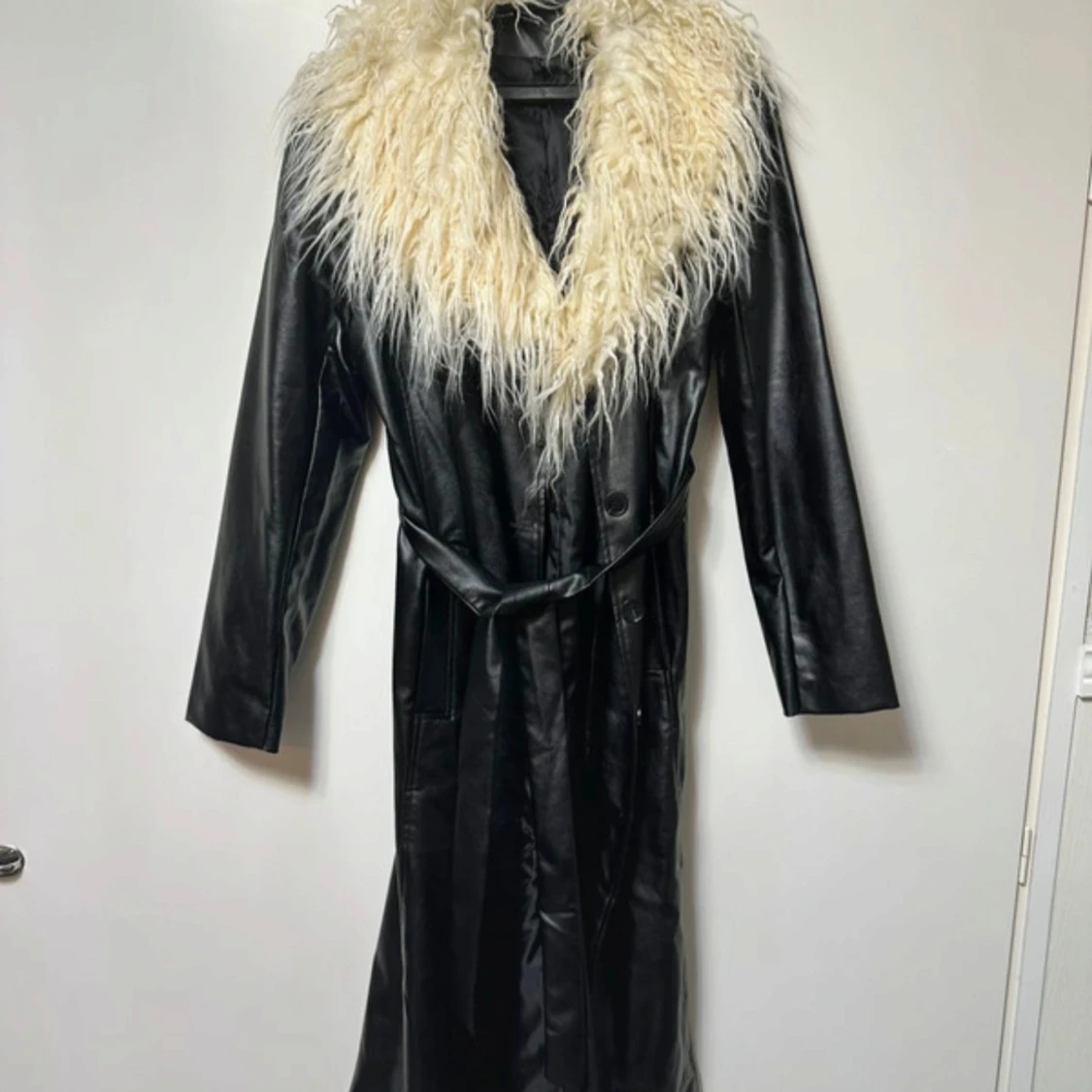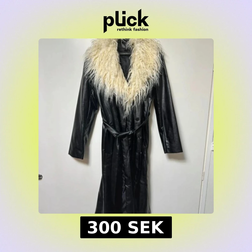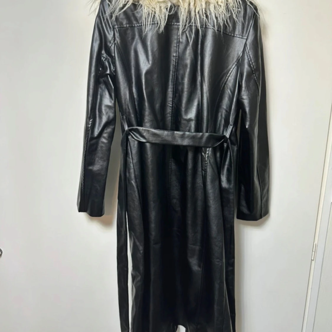 Lång svart skinnrock med stor fluffig vit päls runt kragen. Jackan har bälte i midjan och långa ärmar, vilket ger en riktigt statement look. Perfekt för dig som vill sticka ut med en cool och unik stil. Aldrig använd Längd 117.5cm.