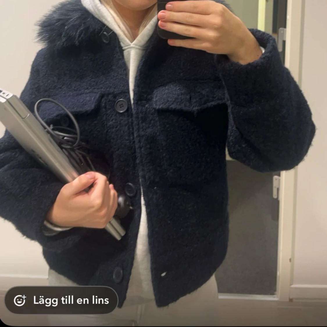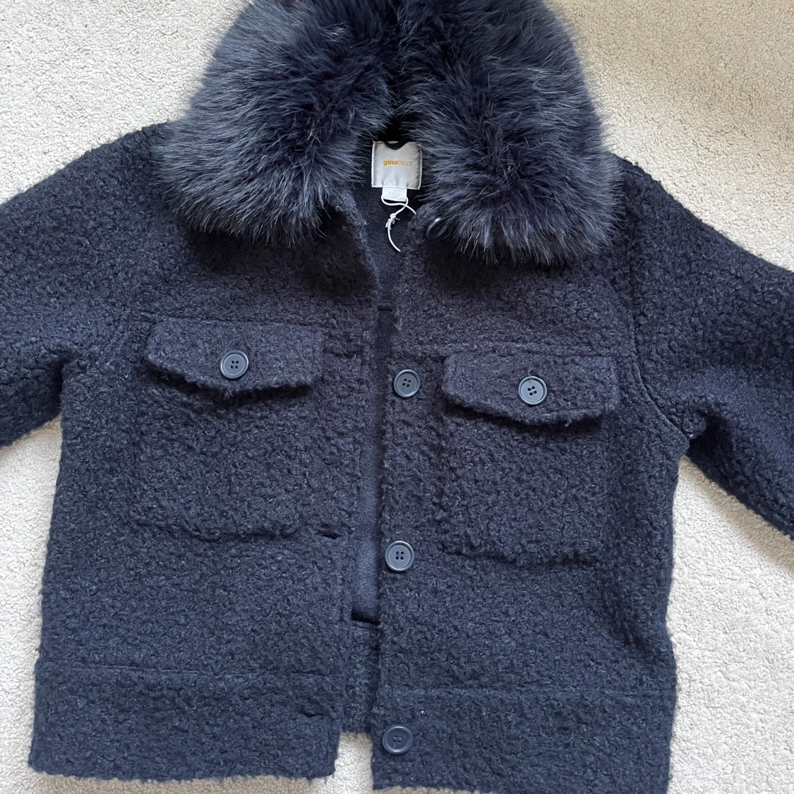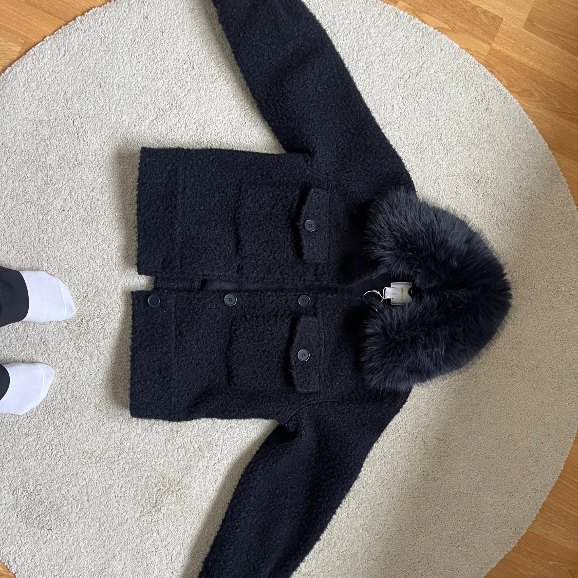 Mysig svart teddyjacka med fluffig fuskpäls vid kragen. Jackan har stora knappar framtill, två bröstfickor med lock. Från Gina Young men passar absolut en xs/s storlek. Använd några gånger men väl omhändertagen så i mycket bra skick! Perfekt till vintern!