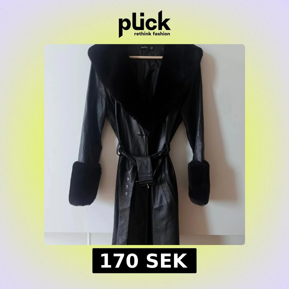 Från Boohoo i storlek 38 (jag bär vanligtvis 36). Det saknas en knapp, annars är jackan i bra skick. Ej äkta läder, ej äkta päls 💞Den är i halvlång modell, beroende på hur lång man är når den till ovanför knäna/till knäna