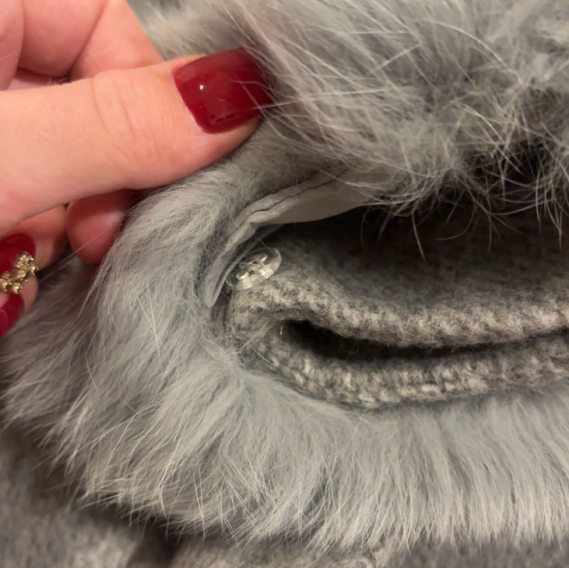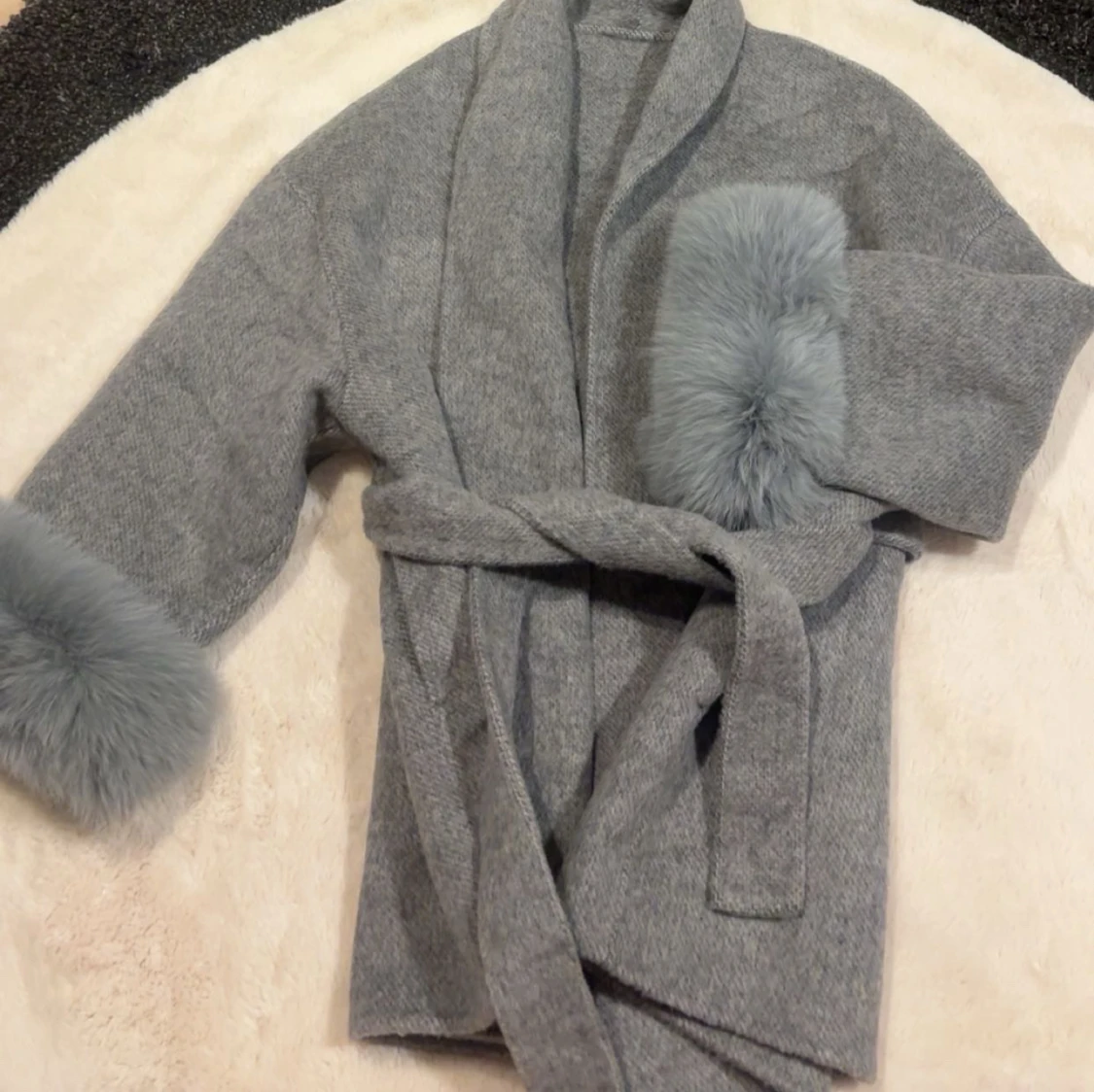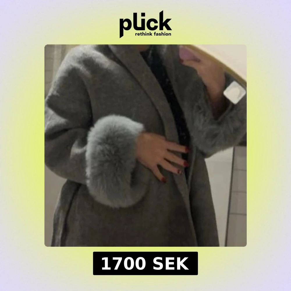 En jättefin trendig kappa med päls längst ärmarna. Det är äkta rävpäls och alpacka tyg. Den är varm och i bra skick. Använt en gång. Ska beställa annan färg.