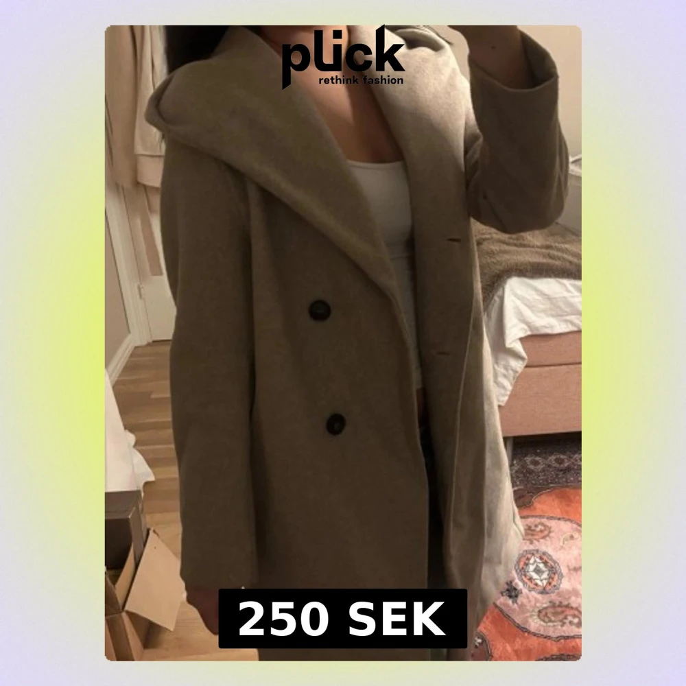 Säljer en beige kappa med breda slag och dubbelknäppning med svarta knappar. Jackan har en rak och loose passform, är lång och har klassisk design. Materialet känns mjukt och har ull-look, perfekt för dig som gillar stilrena och enkla plagg. (inget skärp tillkommer)