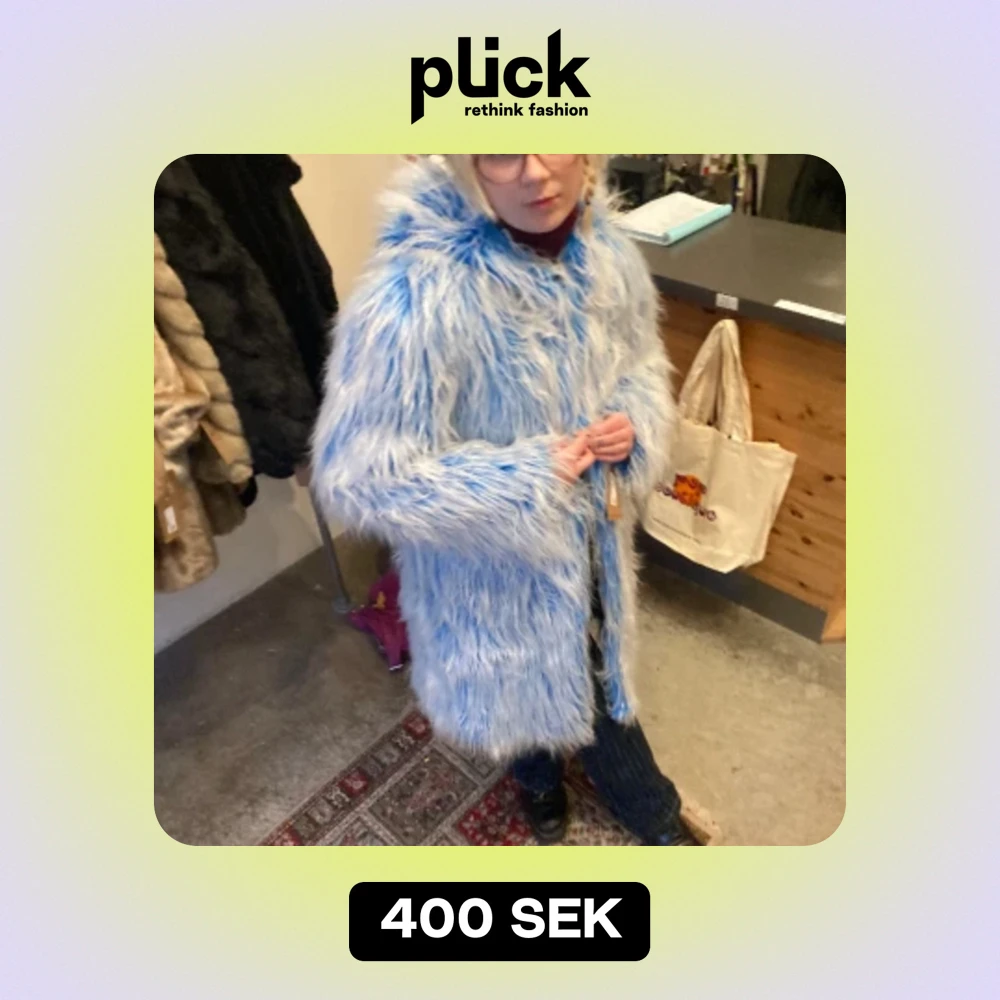 En blå kappa i fejkpäls! Köpt på POP i slutet av november och en del använd. Typ två ”knappar” har lossnat lite men det går att lösa lätt. Fortfarande gott skick! Ursprungspris ca 1600kr (som man ser på sista bilden). Kan gå ner i pris vid snabb affä