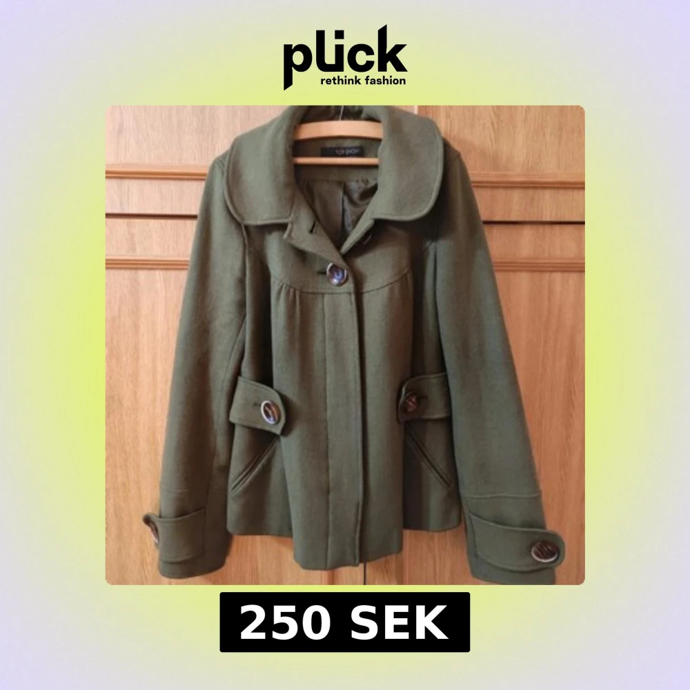 Supersöt grön kappa från Topshop med stora knappar och bred krage. Jackan har långa ärmar och dekorativa knappar vid ärmsluten. Perfekt för höst och vår! Superfint skick, skriv om du har några frågor!