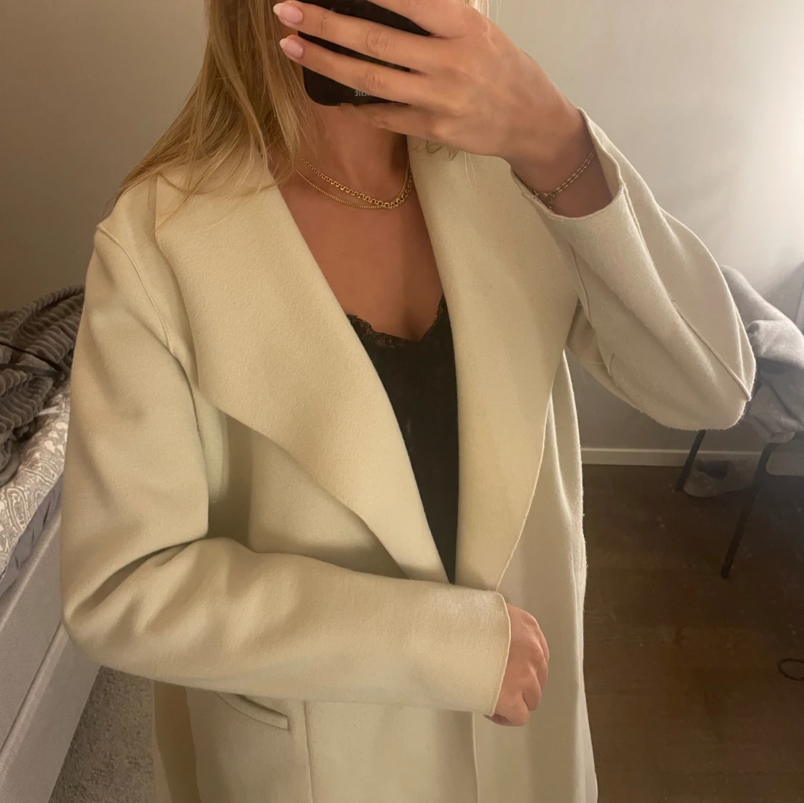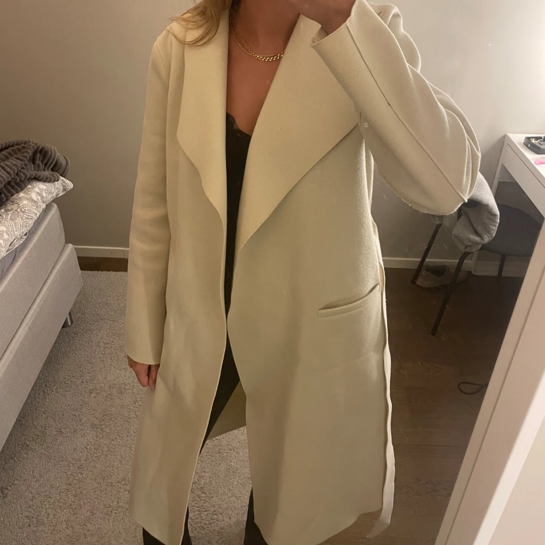 Säljer en super fin lång créme vit/ beige kappa från Vila. Kappan kan vändas ut och in om man vill få ett annat stuk och modell med sömmar! Det finns två fickor i fram samt ett band i midjan. Perfekt jacka till hösten😍😍
