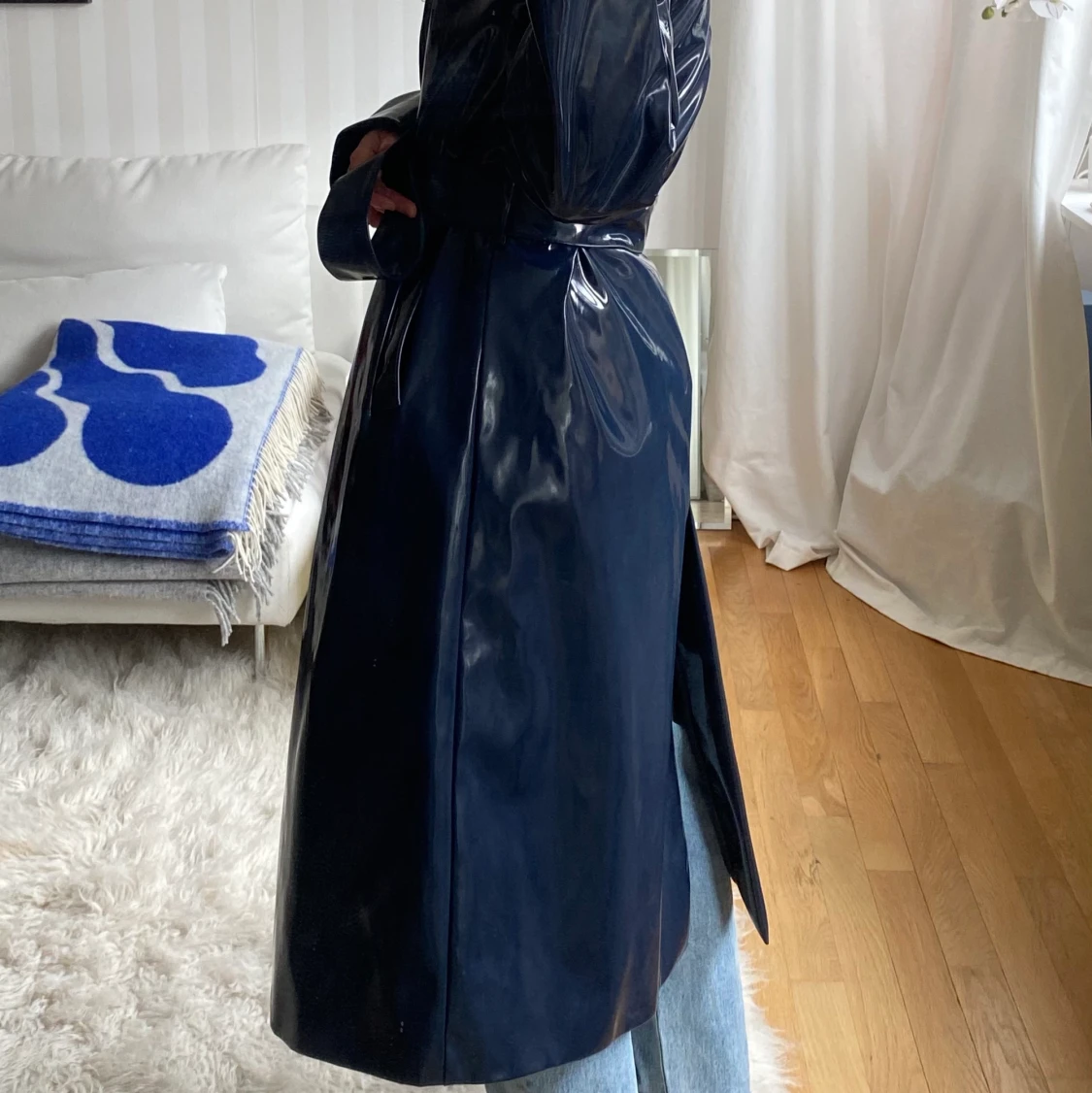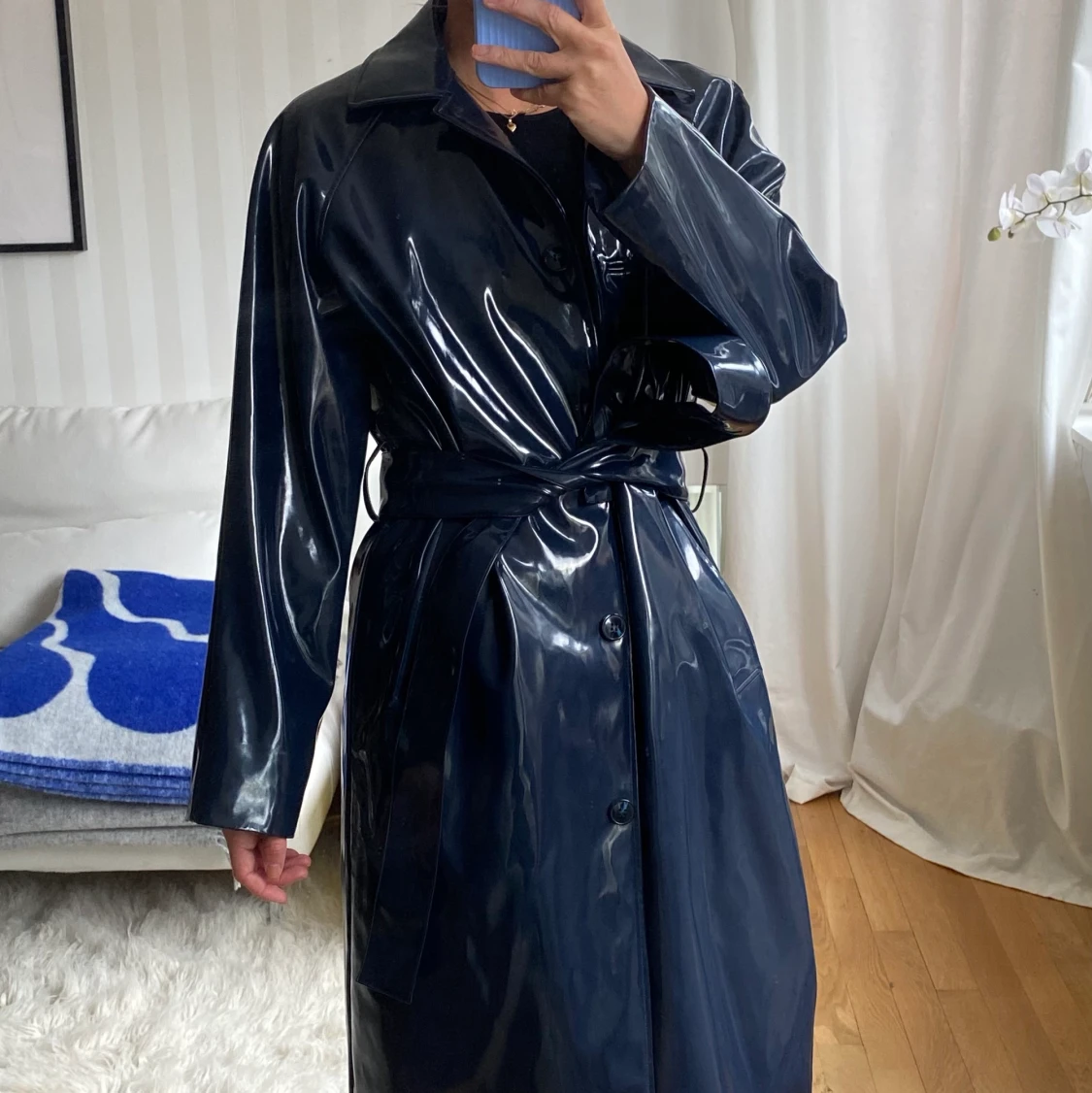 Mörkblå lack-kappa från weekday, perfekt för höstregn, knappar och skärp i midjan, storlek S.