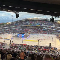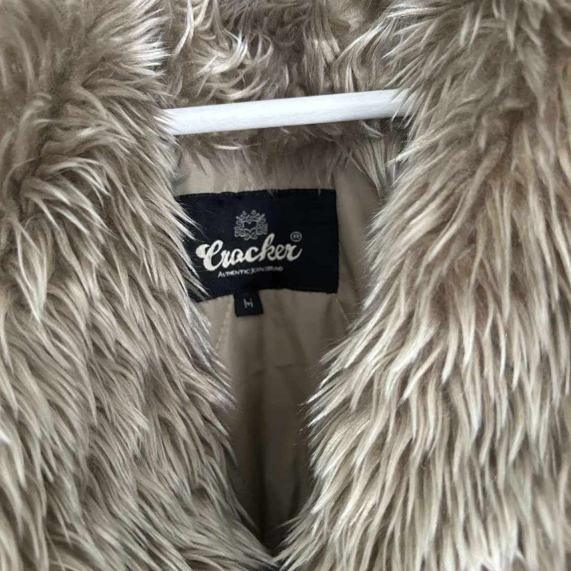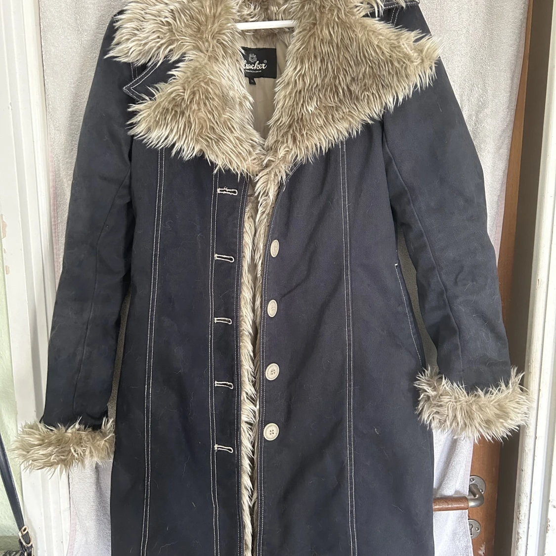 Blå kappa med päls (fake) som går av ta av och på. Storlek M men passar S också. Väldigt stor och varm. I bra skick.