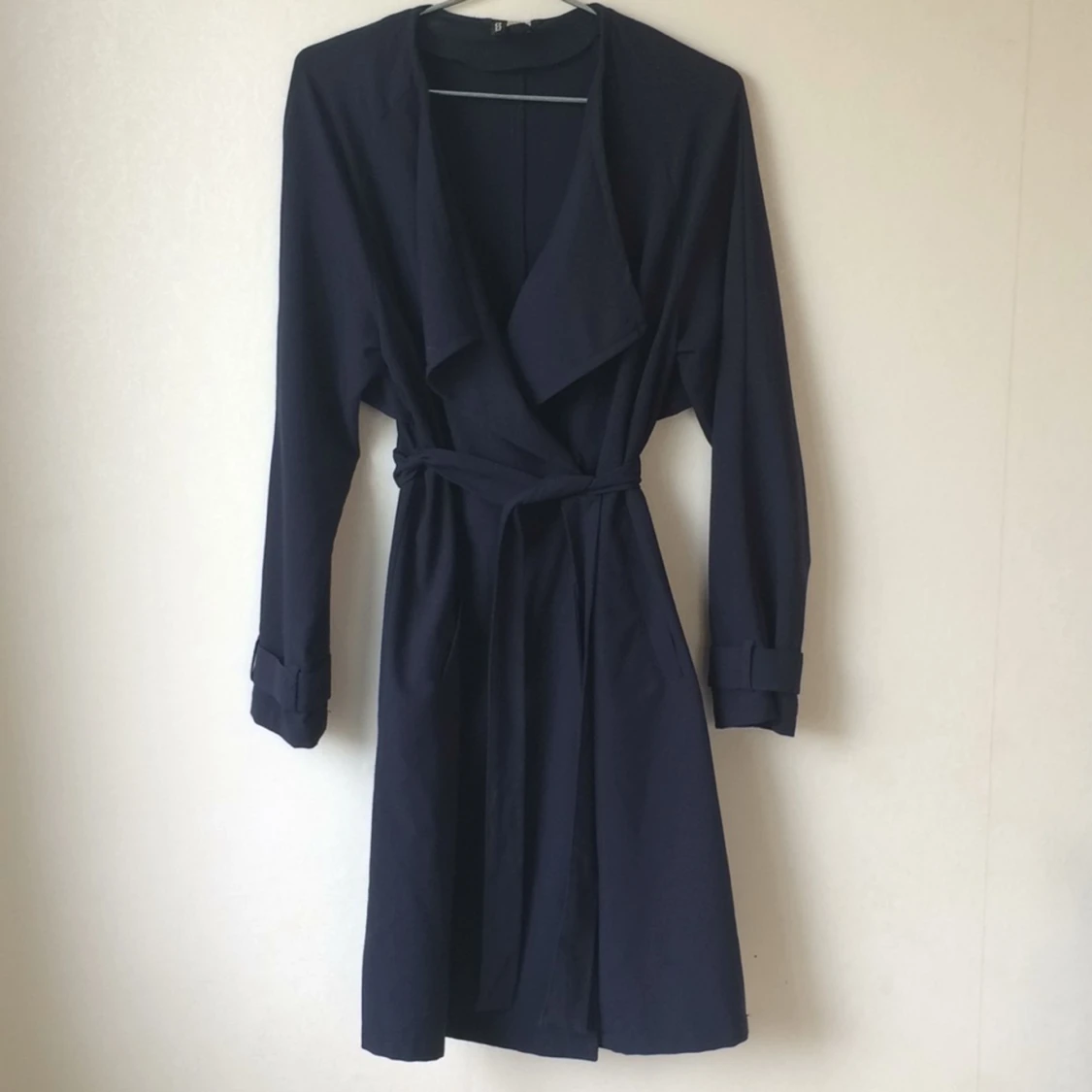 Tunnare höstkappa i klassisk marinblå färg. Superfin att ha till exempelvis jobb som kräver en "smart"klädsel, men fungerar också att "klä ner" med ett par sneakers. Säljer den eftersom den blivit för liten för mig 🥀 Den är köpt på HM.