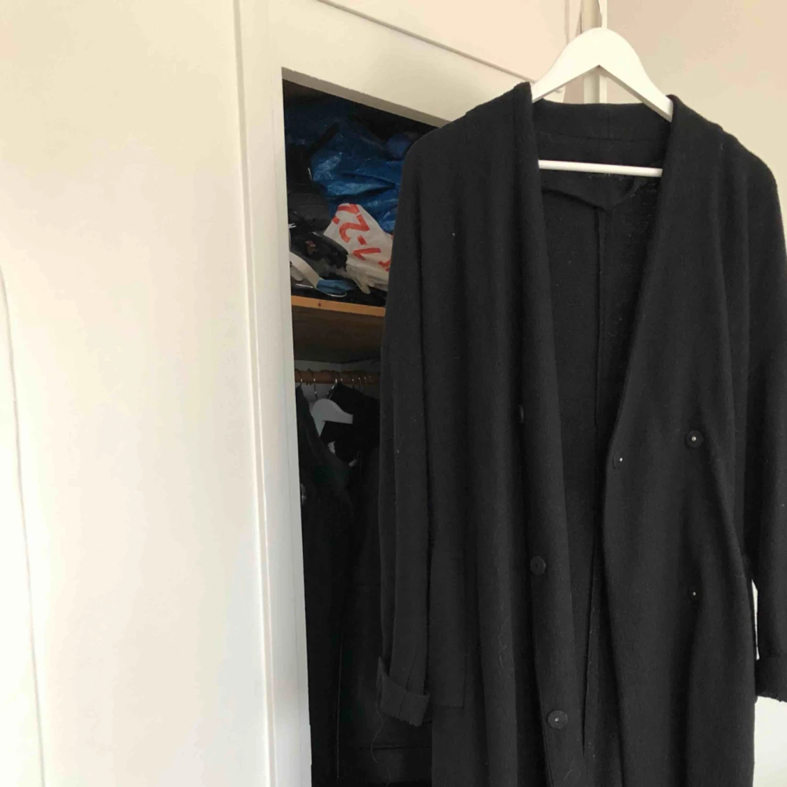 Jättefin lång kappa från Åhléns, liknande Filippa K kappa. Köpt för två år sen, litet hål på ryggen men går att laga. Har vanligtvis storlek 34-36 men denna passar med lite oversize känsla.