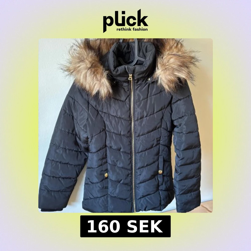 Svart pufferjacka med huva och snygg fuskpäls runt kragen. Storlek 140.