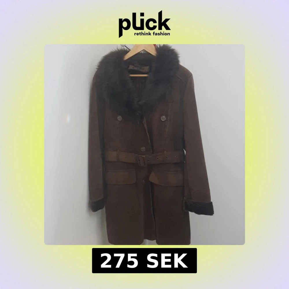 Snygg brun kappa i mocka-look med bred krage i fuskpäls och bälte i midjan. Knappar framtill, stora fickor och pälsdetaljer vid ärmslut. Perfekt för kalla dagar när du vill ha en retro och cool vibe.