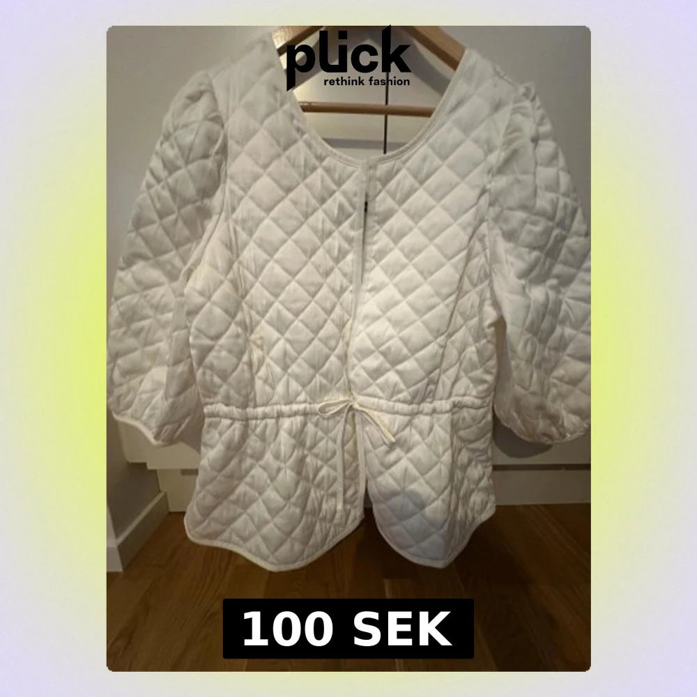 Quiltad vit overshirt från KappAhl i storlek L. Jackan har ett snyggt rutmönster, rund halsringning och knytband i midjan. Materialet är mjukt och känns som bomull, med puffiga långärmar för en trendig look.