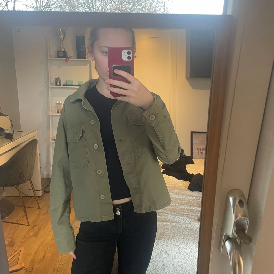 Snygg grön overshirt med knappar framtill och en bröstficka. Perfekt för lager-på-lager-stil. Passar bra till både jeans och kjol.
