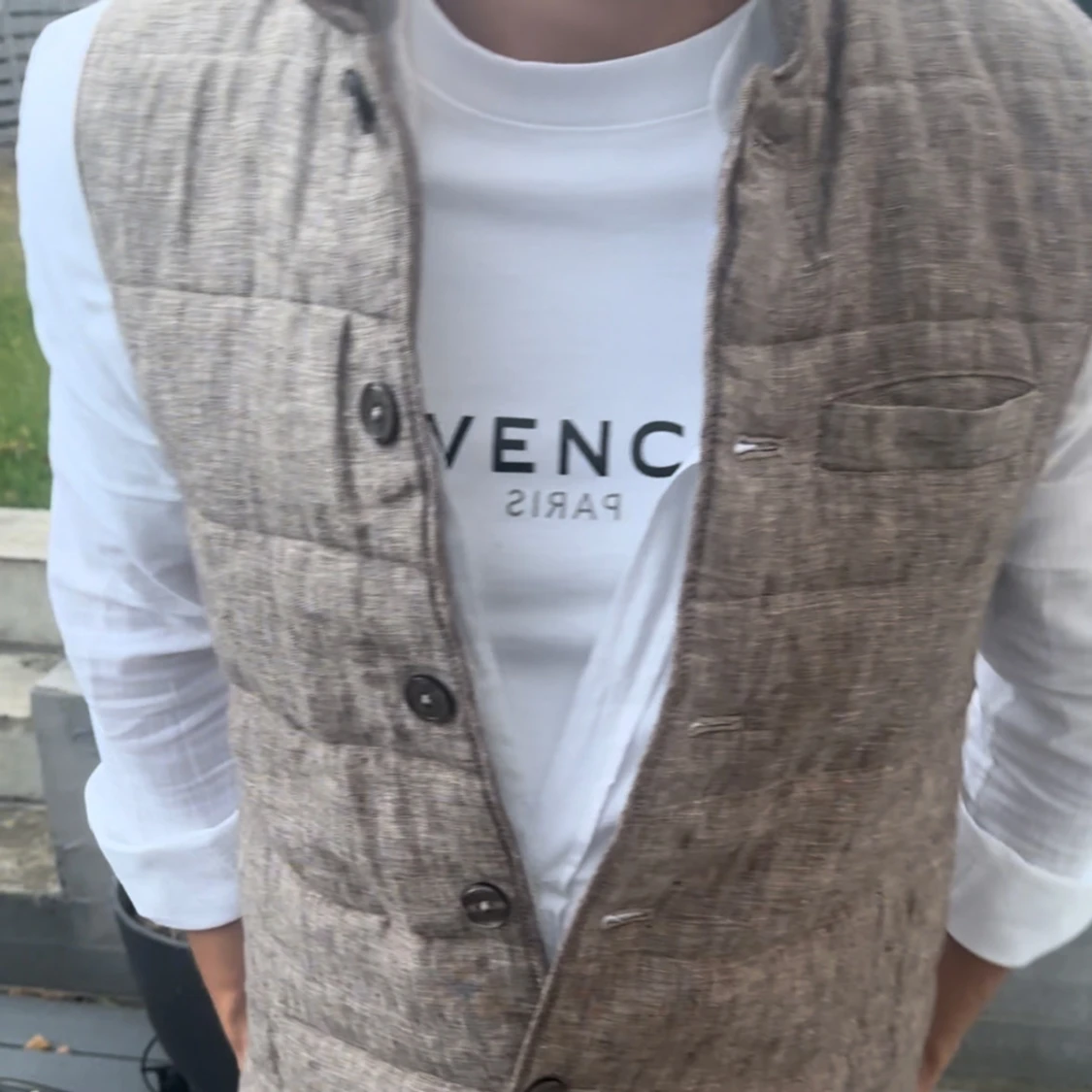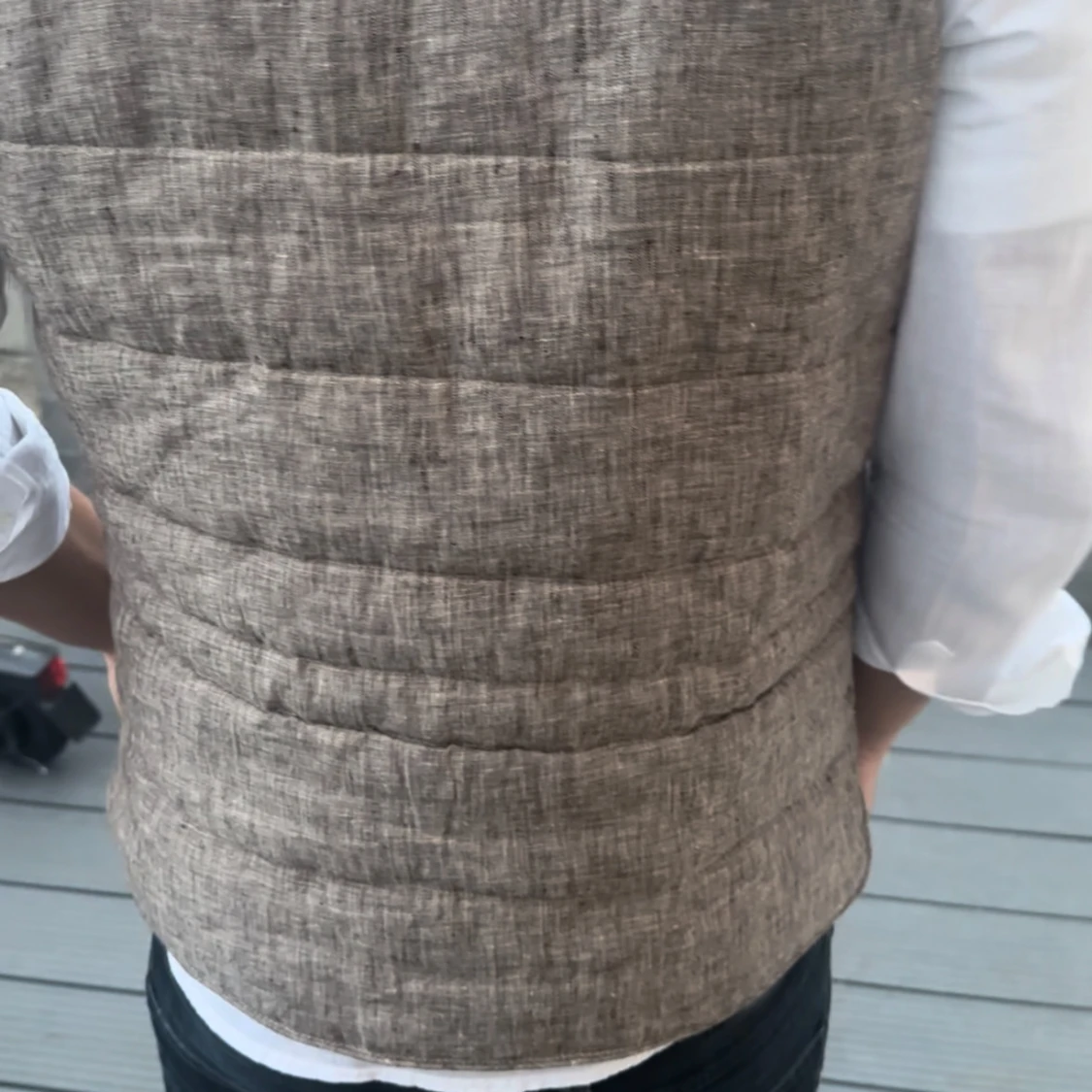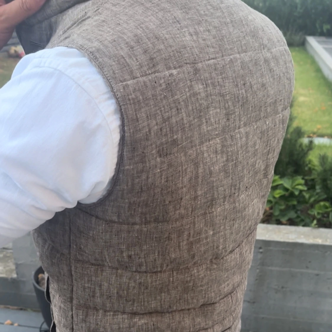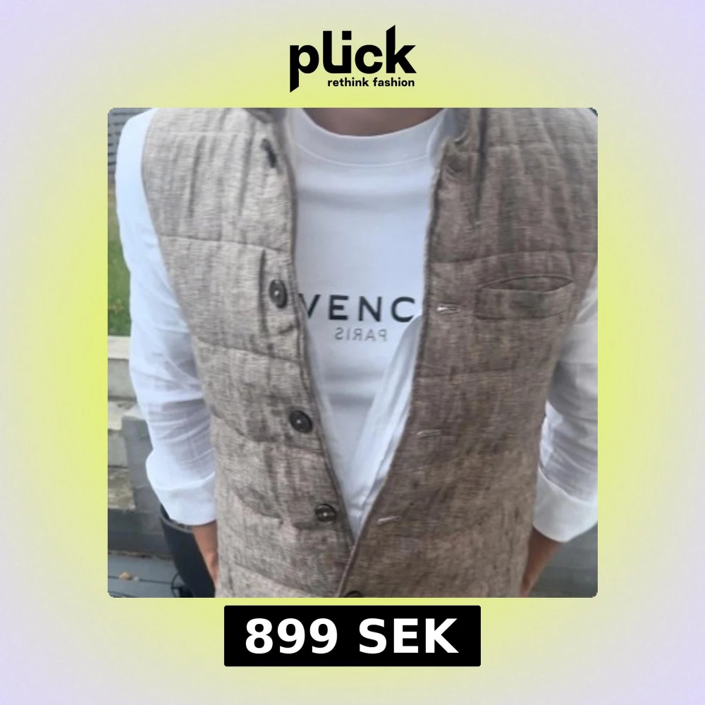 Säljer en beige quiltad dunväst med snygg linnestruktur och knäppning framtill. Västen har en stilren look med diskreta sömmar och en liten bröstficka. Perfekt att slänga över en skjorta för en clean och modern vibe.
