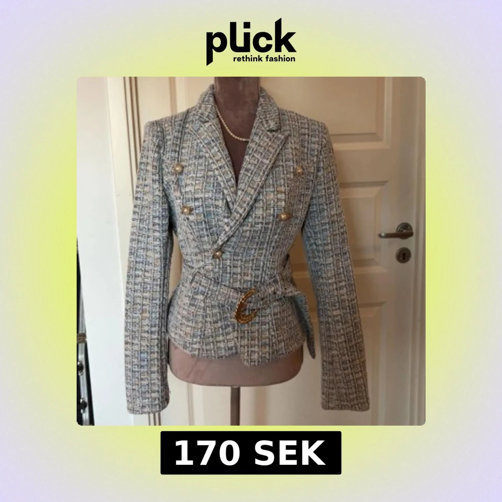 Snygg rutig kavaj i ljusa toner med guldiga pärlknappar och bälte med gulddetalj. Jackan har markerad midja, dubbelknäppning och klassisk krage. Materialet är strukturerat och känns lyxigt, perfekt för dig som gillar en chic och trendig look.