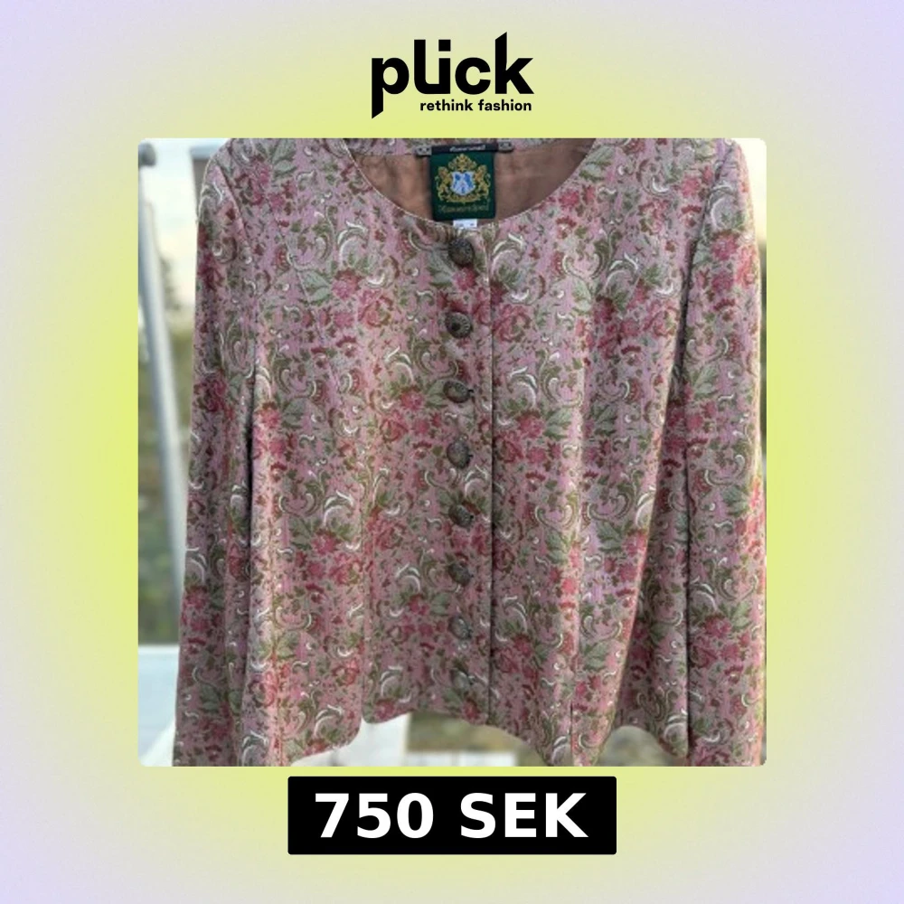Unik kvalitets kavaj från Hammerschmid i rosa och grönt med blommigt mönster och snygga metallknappar. Jackan har rundad halsringning, vackra sprund bak, lång ärm och är tillverkad i ett vävt tyg med exklusiv känsla. Bystmått 54 cm (mätt fram från arm till arm) och längd 59 cm . MYCKET FINT SKICK! Och nu en bråkdel av ny pris!