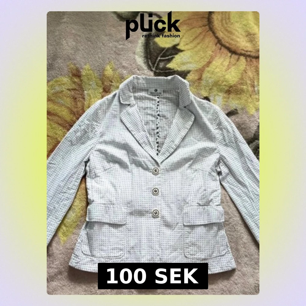Snygg vit kavaj från Deni Cler med svart rutigt mönster och tre dekorativa knappar framtill. Jackan har klassisk krage, två fickor med lock och långärmad design. Perfekt för dig som gillar stilrena och unika detaljer.