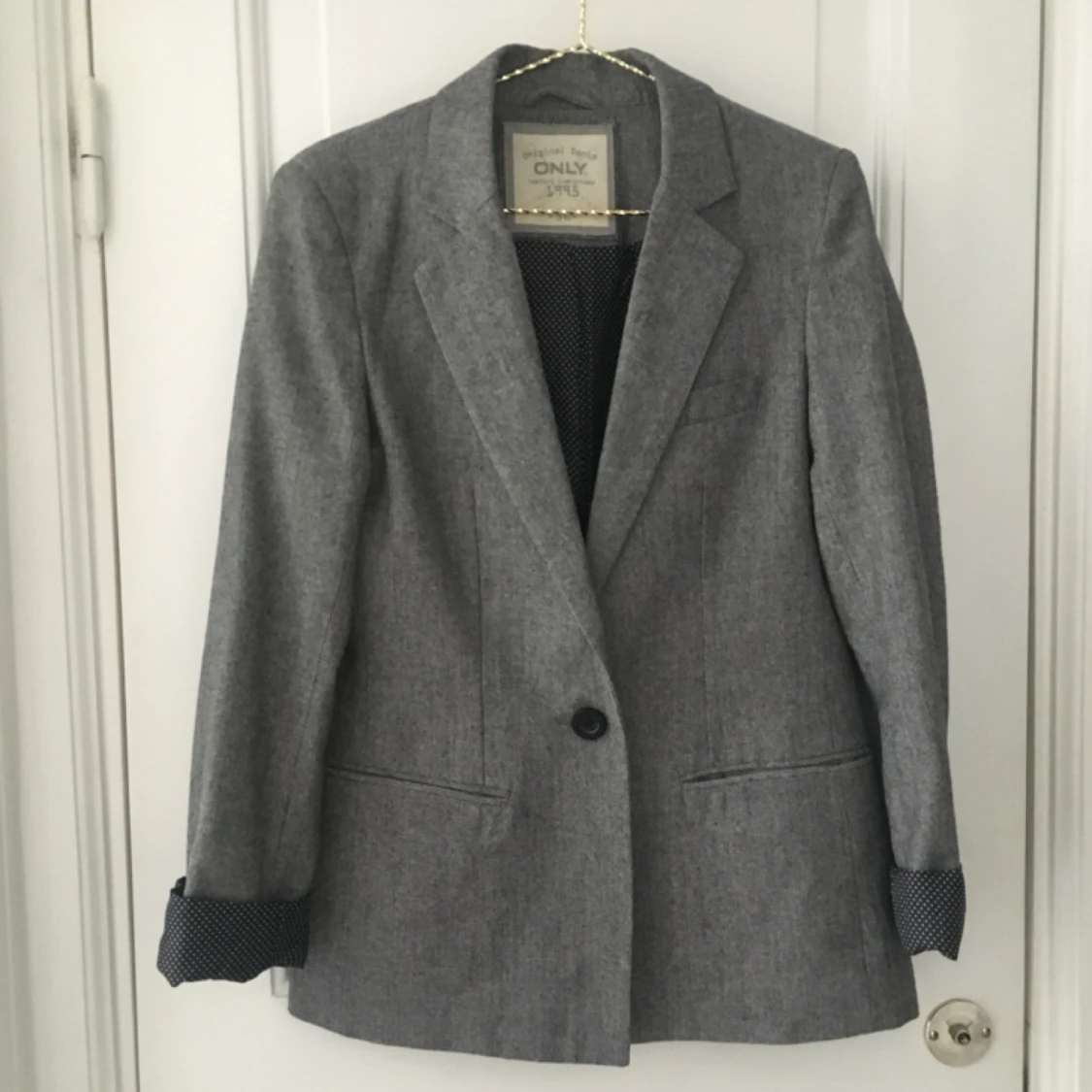 Grå kavaj med snyggt prickigt innertyg. Tidlös och stylish! Storlek 36. Köpare betalar frakt :)