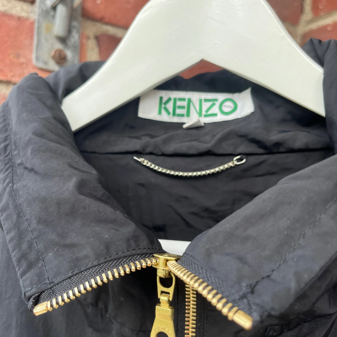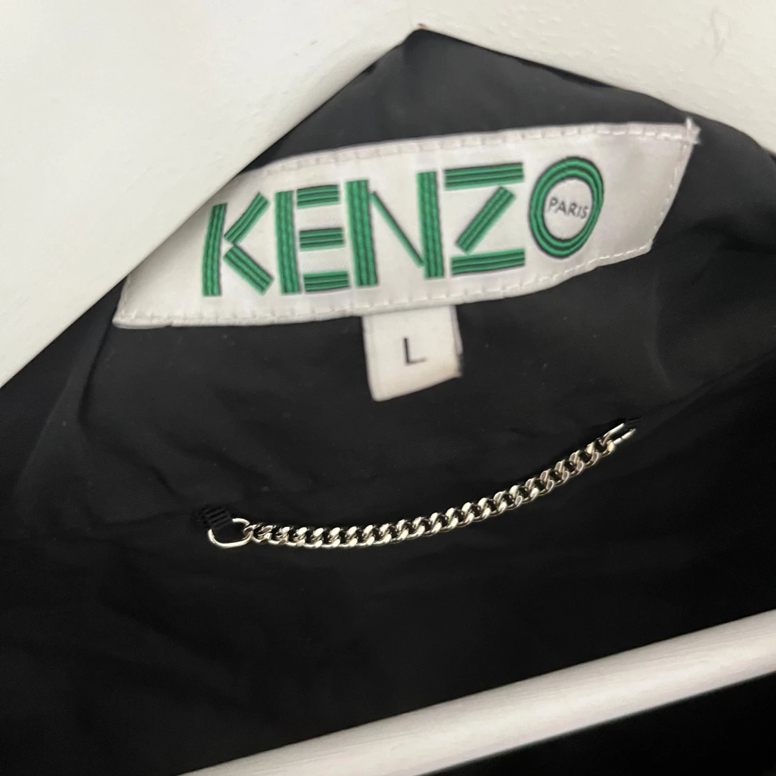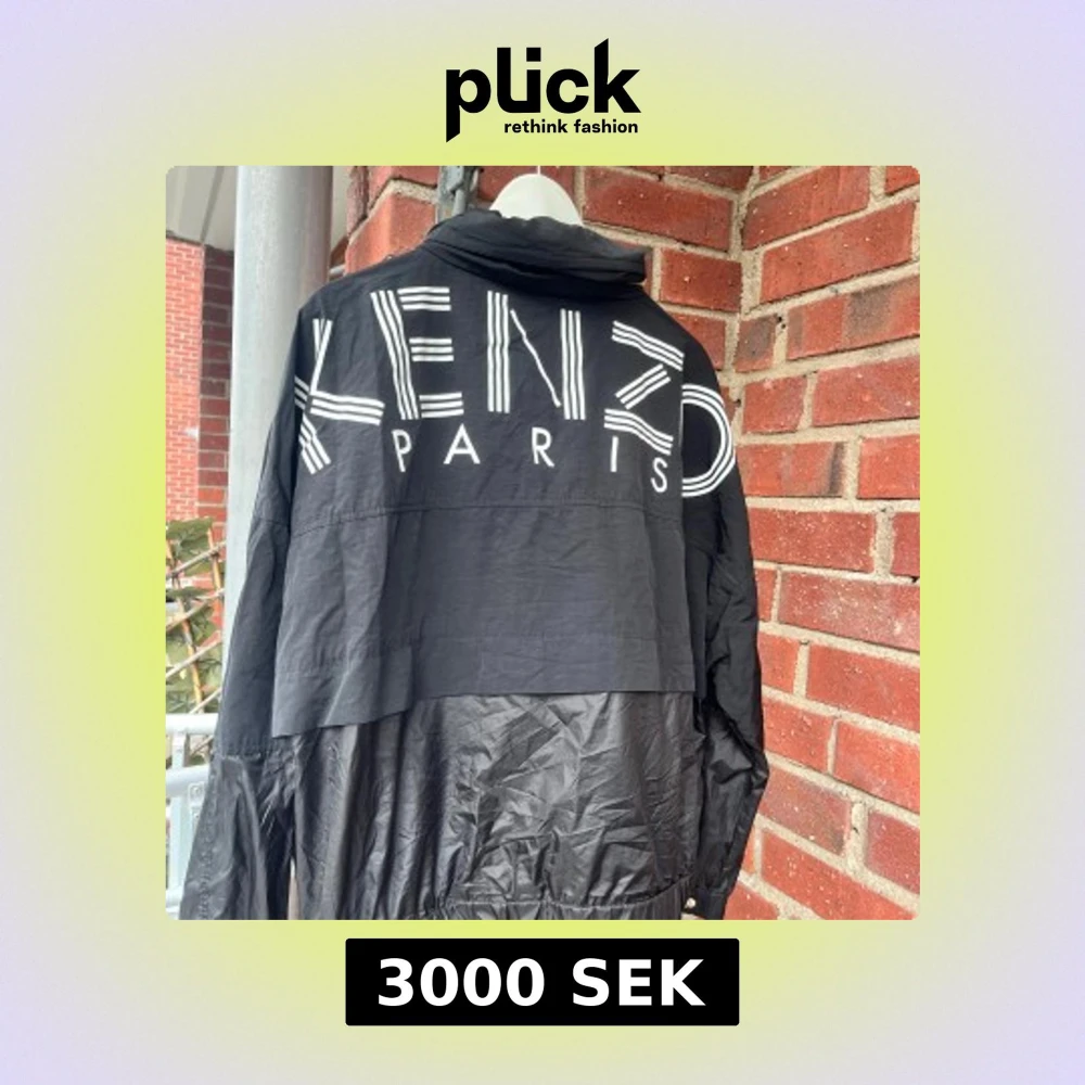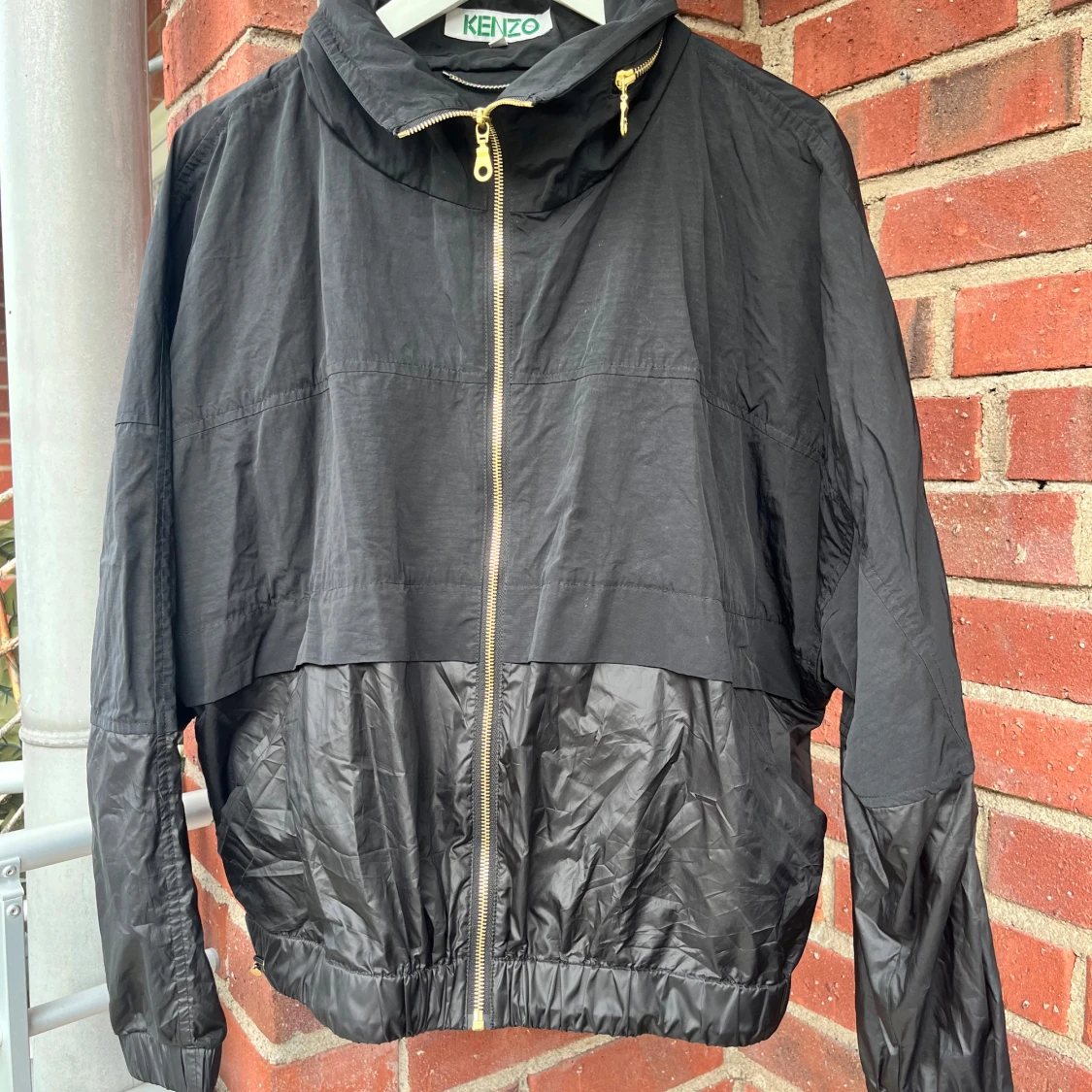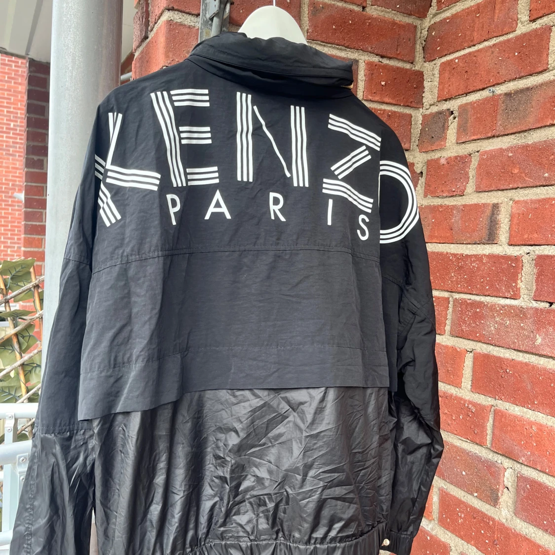 Snygg svart vindjacka från Kenzo med stort tryck på ryggen. Jackan har en dragkedja i guld och en hög krage. Jackan är köpt på Kenzo i Paris för 6800:- använd en gång
