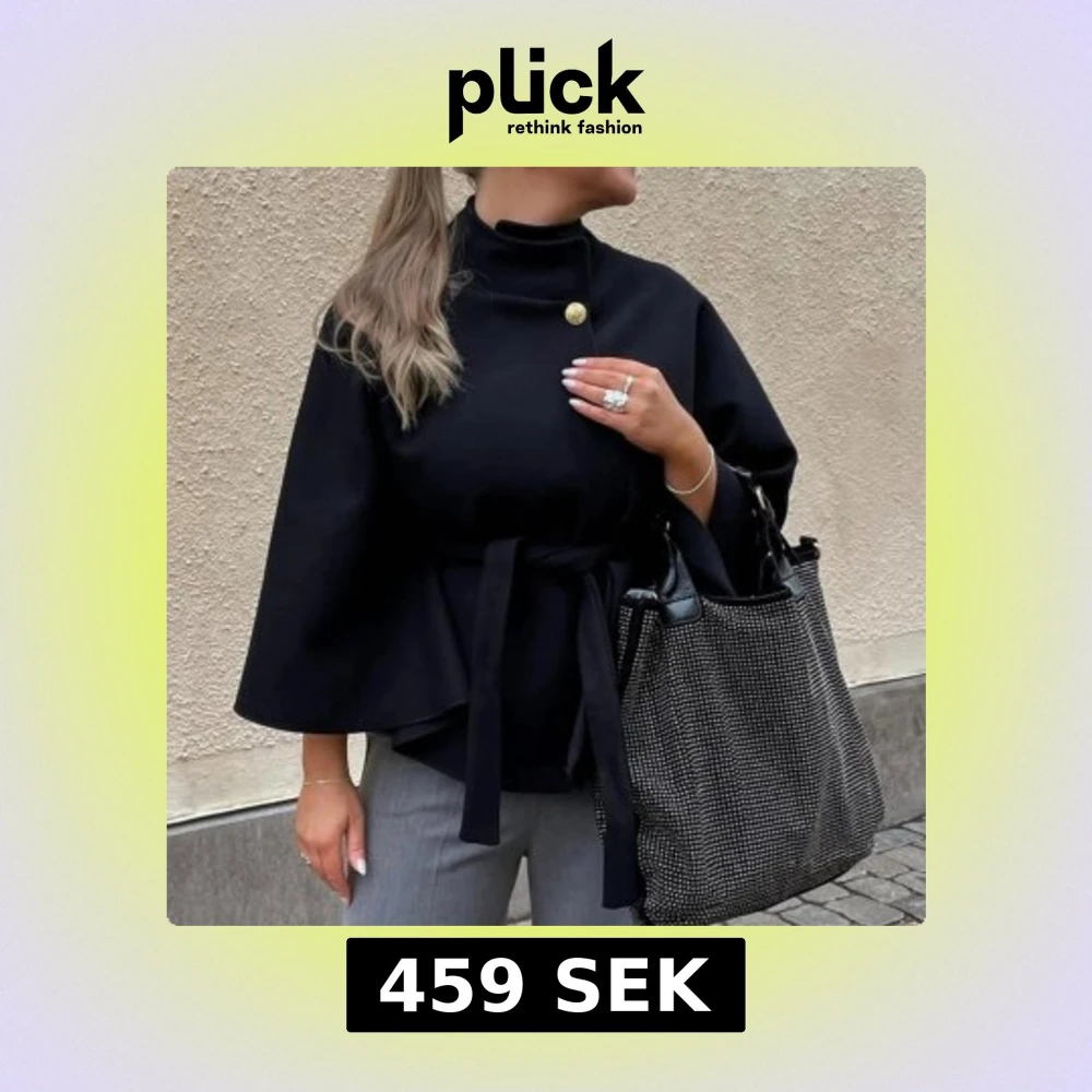 Helt ny med lappen på , passar ej i den !!!Elegant svart kappa med hög krage och knytband i midjan. Den har en knappdetalj vid halsen och vida ärmar som ger en stilren look. Perfekt för att höja din outfit till nästa nivå.