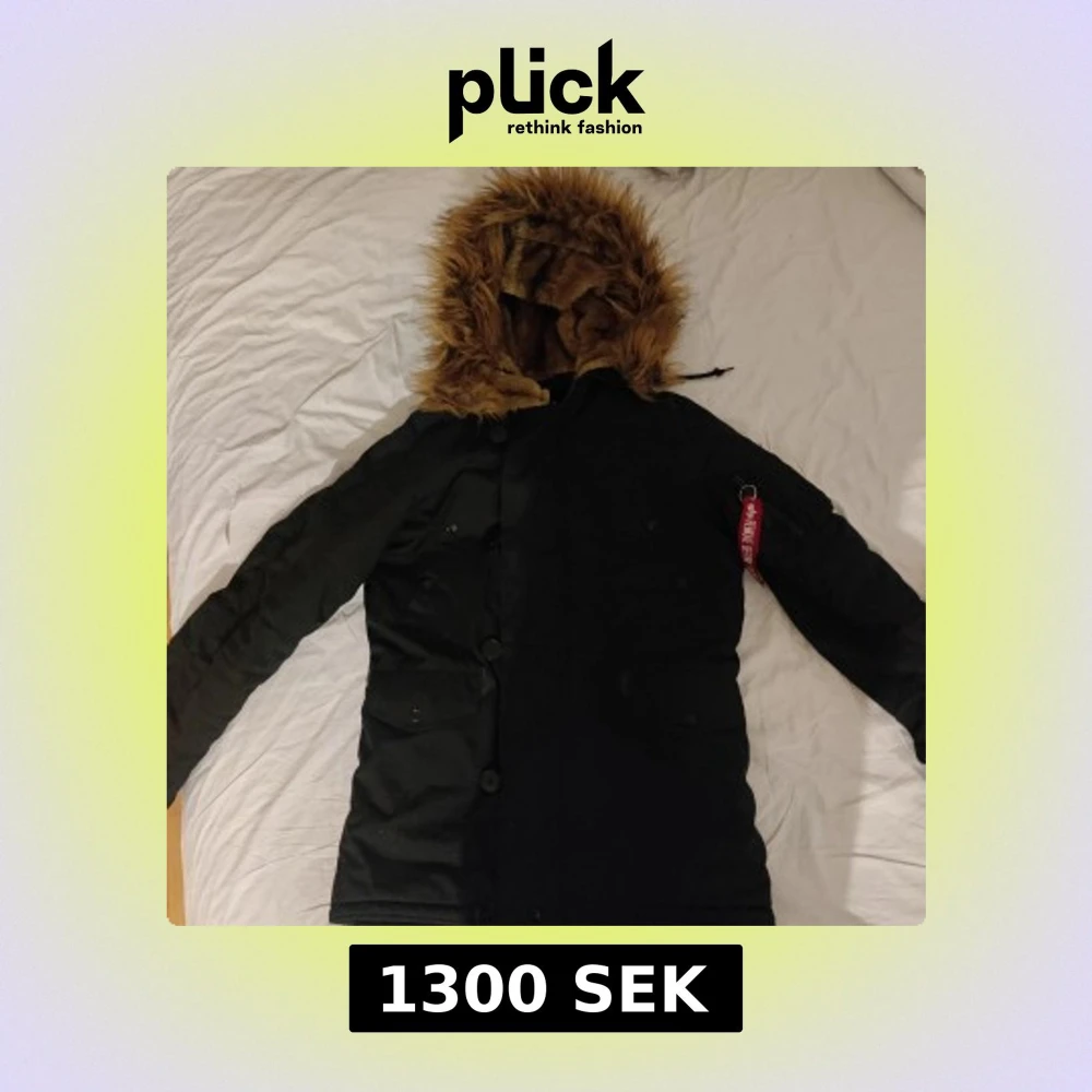Säljer en svart parkajacka från Alpha Industries i storlek medium. Jackan har huva med brun päls, knappar och dragkedja framtill samt en röd detalj på ärmen. Perfekt för kyliga dagar.