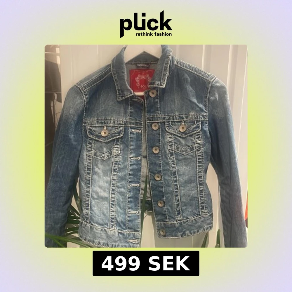 Snygg blå jeansjacka från edc med coola slitningar och kontrastsömmar som ger en vintage look. Jackan har knappar framtill, två bröstfickor med lock och lång ärm.