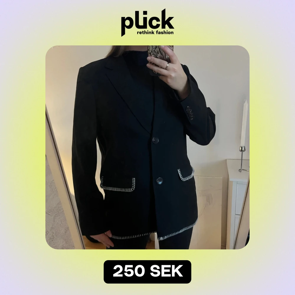 Snygg svart kavaj med vita sömmar som ger en cool kontrast. Den har en klassisk passform med knappar framtill och långa ärmar. Perfekt för både vardag och fest!