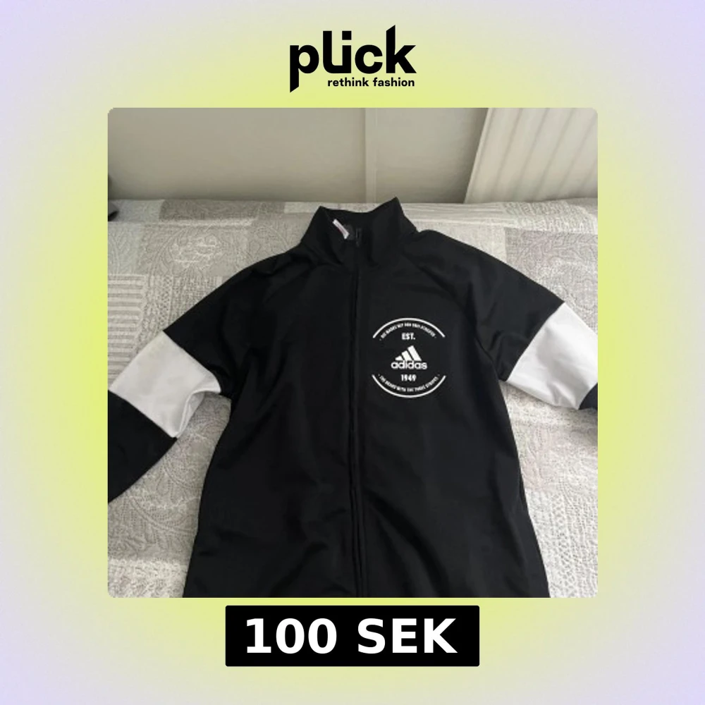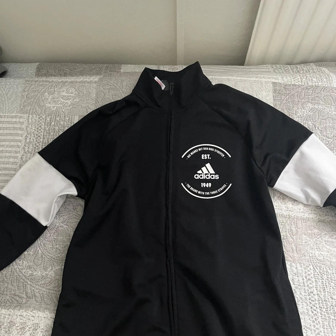 Snygg svart kofta från Adidas med dragkedja framtill. Jackan har långa ärmar och ett tryck på bröstet med Adidas-loggan och text. Perfekt för en sportig look! Storlek M