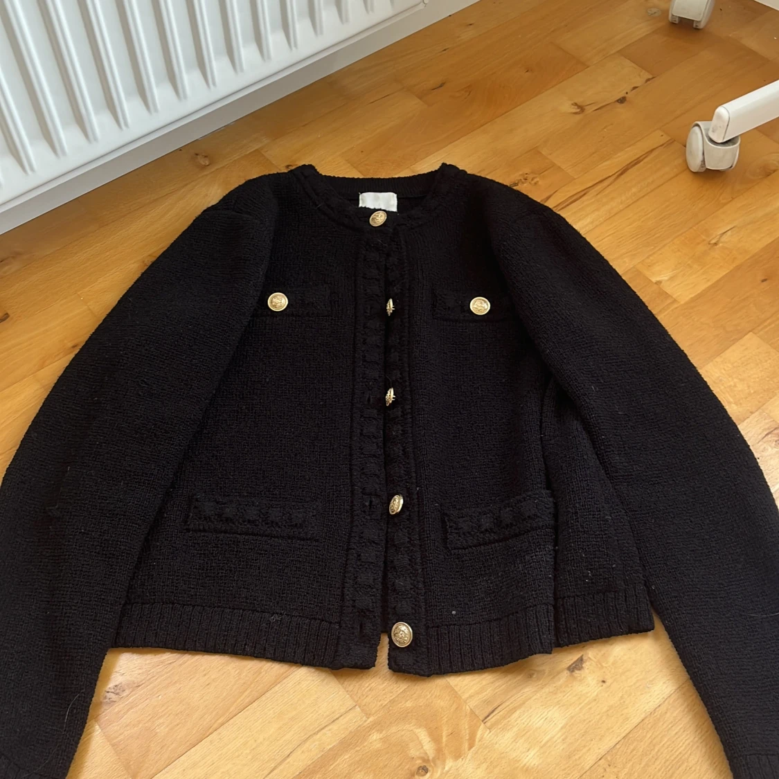 Snygg svart kofta med guldknappar framtill och på fickorna. Koftan har rund hals, ribbade muddar och är stickad i ett mjukt material. Perfekt för dig som gillar klassisk stil med en twist. Fyra fickor framtill ger extra detaljer.
