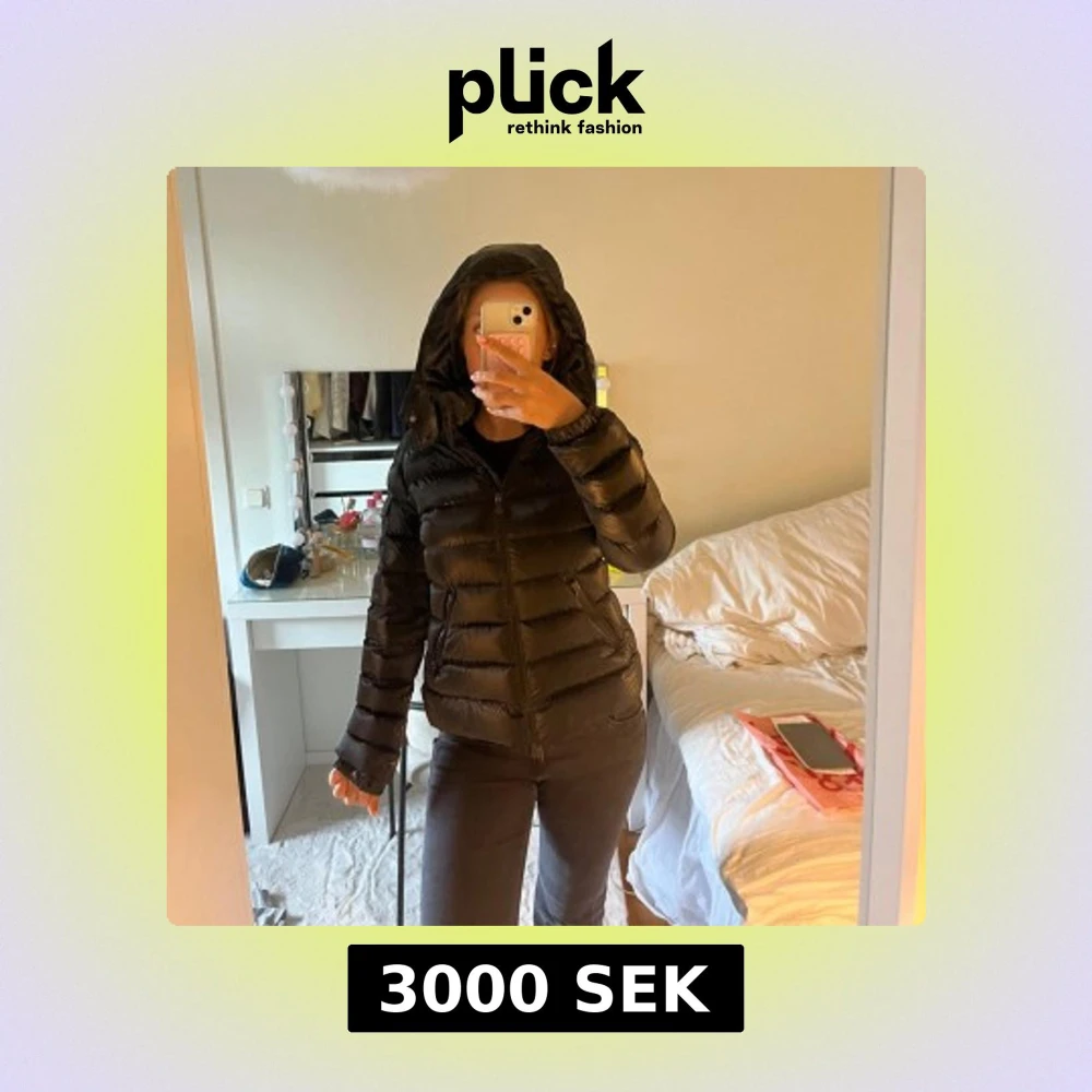 Svart moncler pufferjacka med glansig yta och huva. Jackan har quiltad design, dragkedja framtill och långa ärmar. Snygg och varm för kalla dagar, med en klassisk look som funkar till jeans eller mjukis. Perfekt för dig som gillar streetstyle och vill ha en jacka som sticker ut. ( slitningar under armhålerba och vid armen det ser ni på bilderna ). Köpt för 6000! Storlek ”14år” passar mig som bär S