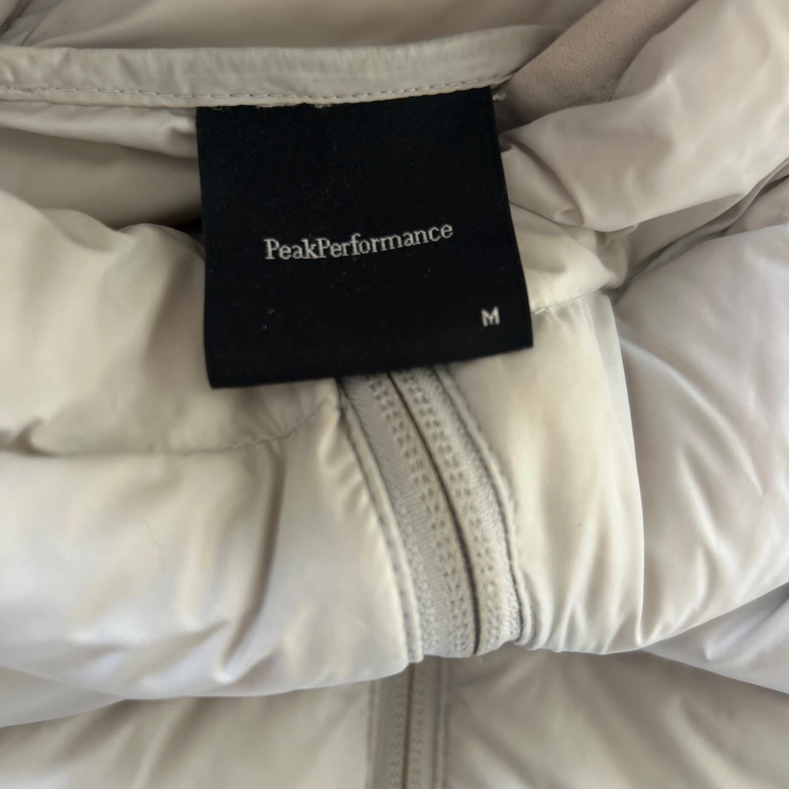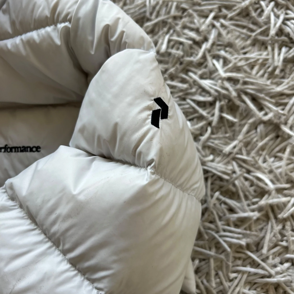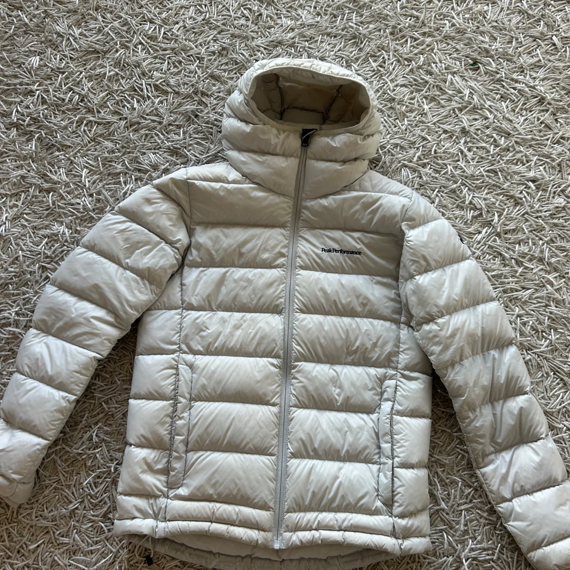 Säljer en snygg vit dunjacka från Peak Performance i storlek M. Jackan har en puffig look, huva, dragkedja framtill och diskret logga på bröstet samt ärmen. Perfekt för kalla höst- och vinterdagar. 🤍🩶