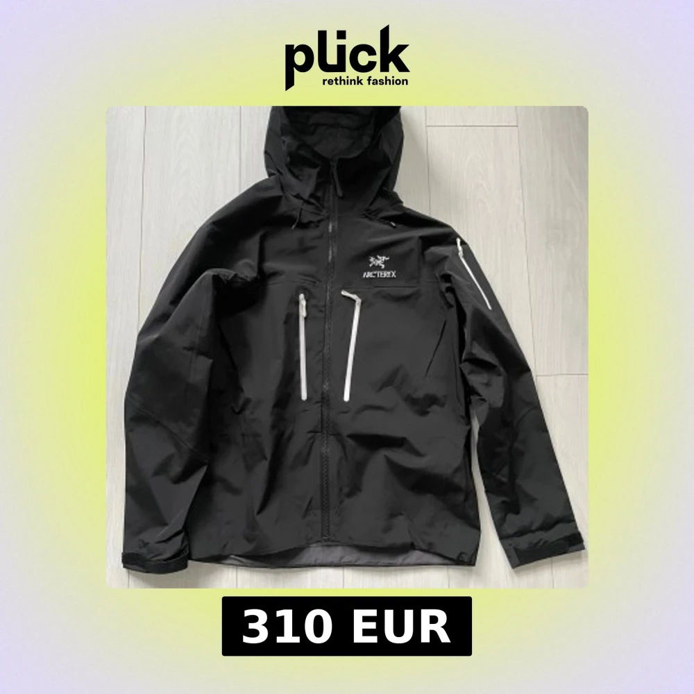 Säljer en svart vindjacka från Arc'teryx med vit logga och dragkedjor. Jackan har en justerbar huva och flera praktiska fickor med dragkedja. Perfekt för utomhusaktiviteter och skyddar mot vind och regn.