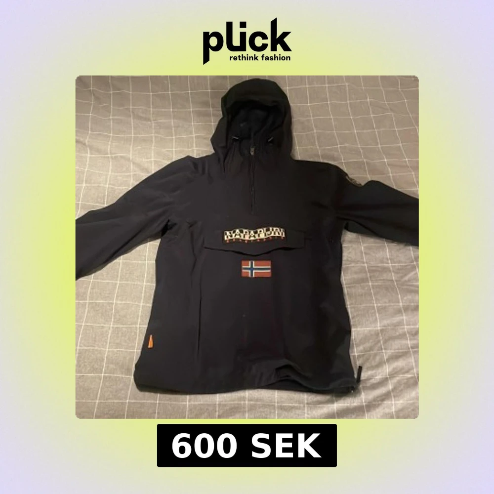 Svart vindjacka från Napapijri med huva, halv dragkedja och stor ficka framtill med logga och norsk flagga. Jackan är tillverkad i slitstark polyester. Perfekt för blåsiga dagar och höst vädret. Den är i storlek L men passar även om du har M. Det är bara att skriva om du har några frågor.