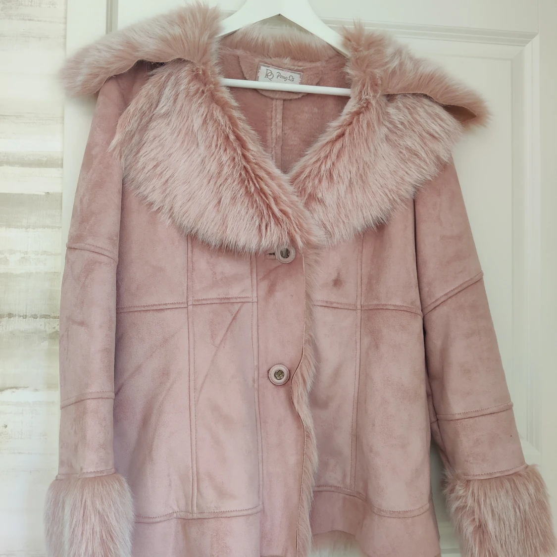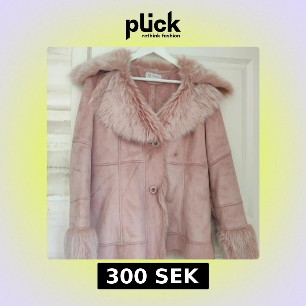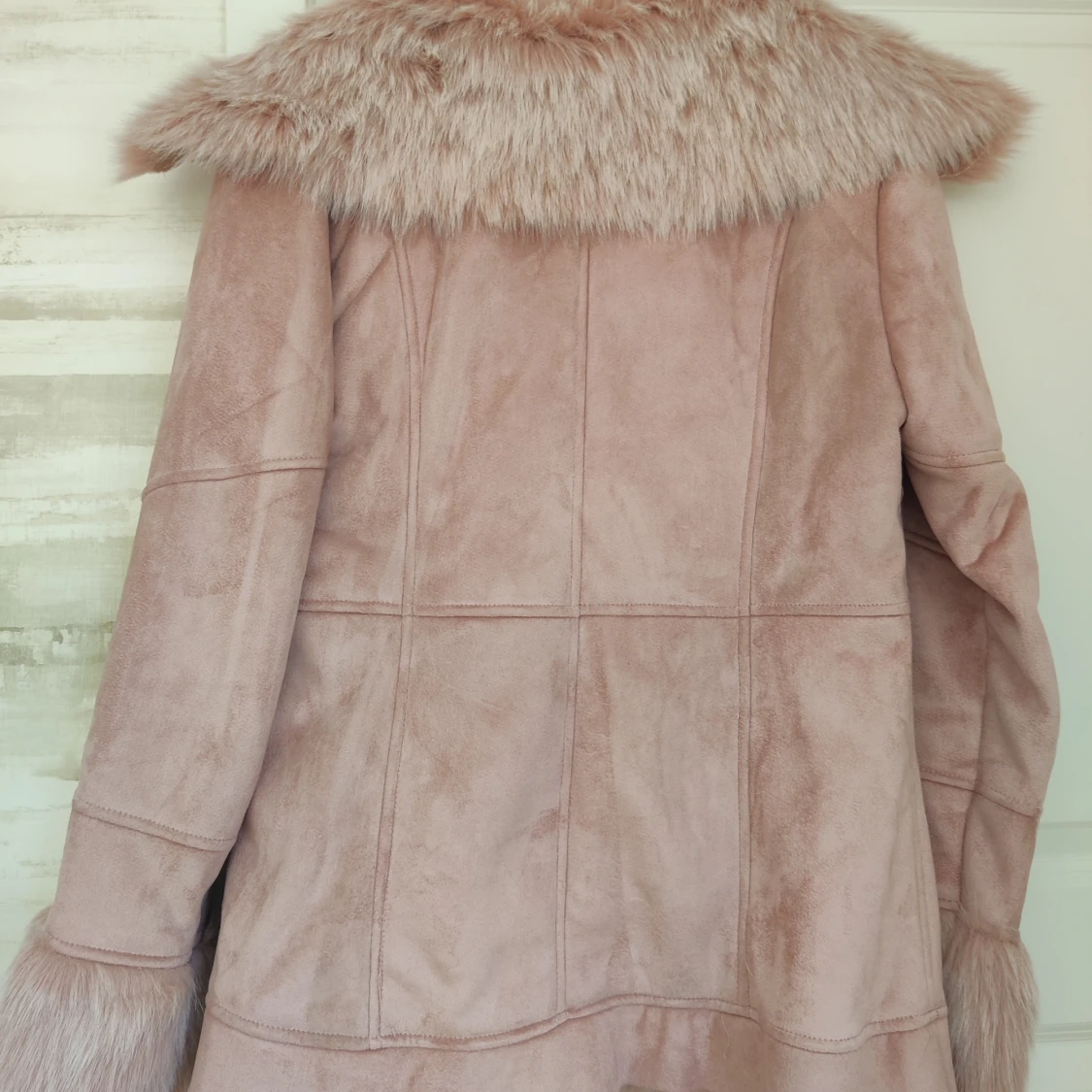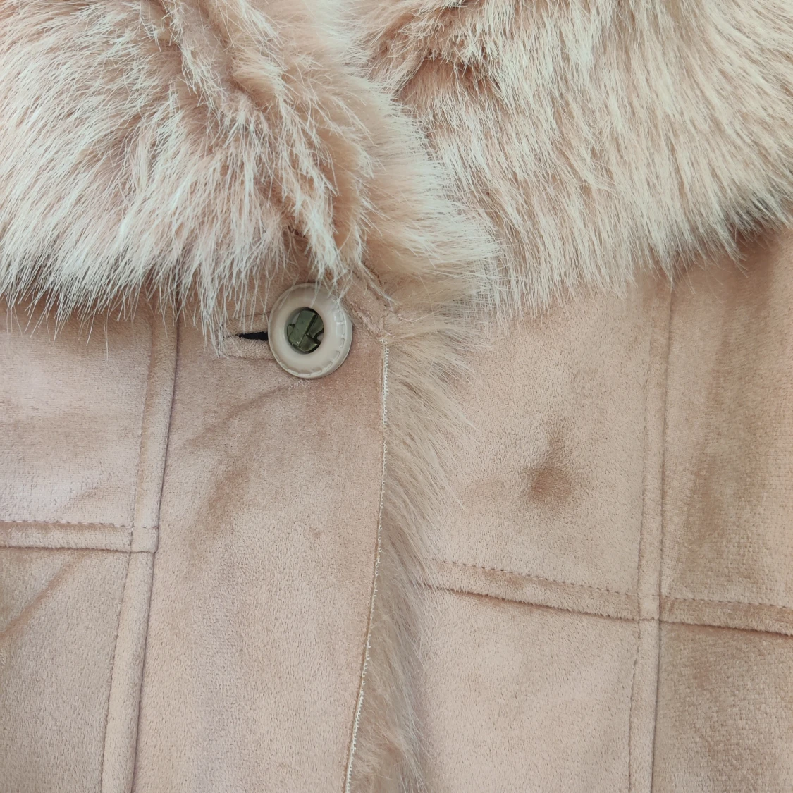 Rosa faux suede jacka med fuskpälsdetaljer på krage och ärmslut. Dammigt rosa, tycker den är lite ljusare på bild än vad den är i verkligheten. Fuskpäls på insidan. Storlek L. Köptes vintage, jag har bara använt den ett par ggr.
