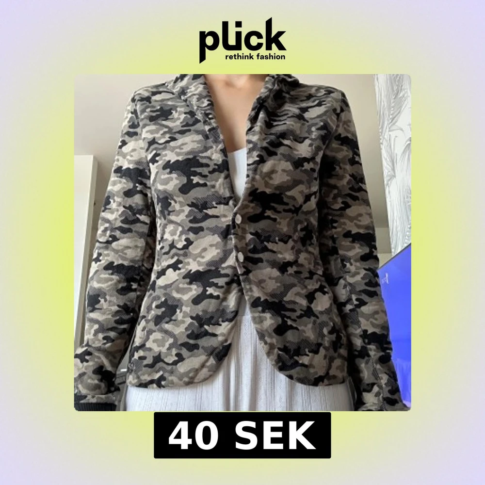 Snygg kavaj i camouflage-mönster med grå, svarta och beige toner. Jackan har smal passform, klassisk krage och knäppning framtill. Perfekt för dig som vill sticka ut med en edgy look. Långärmad och tillverkad i mjukt bomullsmaterial. Ganska liten i storlek - har själv S o den passar