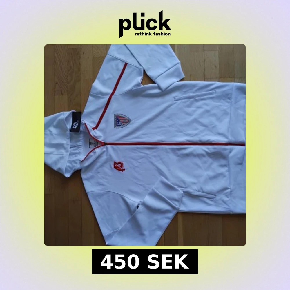 Vit vindjacka från AB Sport med röd dragkedja och röda detaljer. Jackan har huva, två sidofickor och klubbmärke för Moghreb Athletic Tétouan på bröstet. Tillverkad i lätt polyester, perfekt för sportiga dagar. Snygg och stilren design med broderad logga.