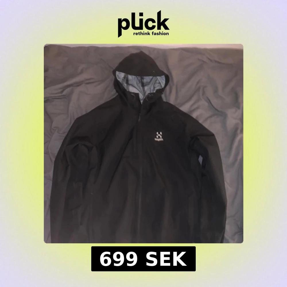 Säljer en svart skaljacka från Haglöfs med huva och dragkedja framtill. Jackan har minimalistisk design och är perfekt för utomhusaktiviteter. Lätt och smidig med diskret logga på bröstet.