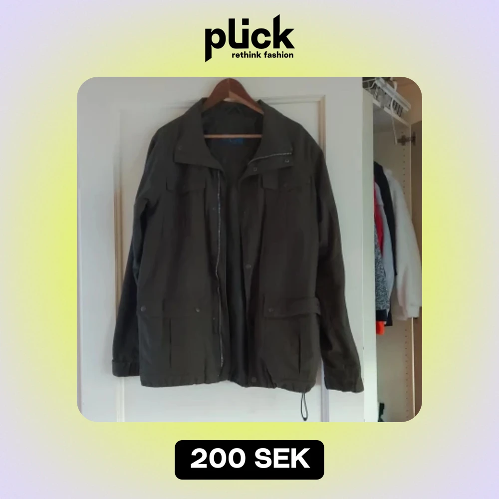 Säljer en grön vindjacka som är perfekt för höst och vår. Jackan har en dragkedja framtill och flera praktiska fickor med knappar. Den är långärmad och har en justerbar dragsko i nederkanten för bättre passform.