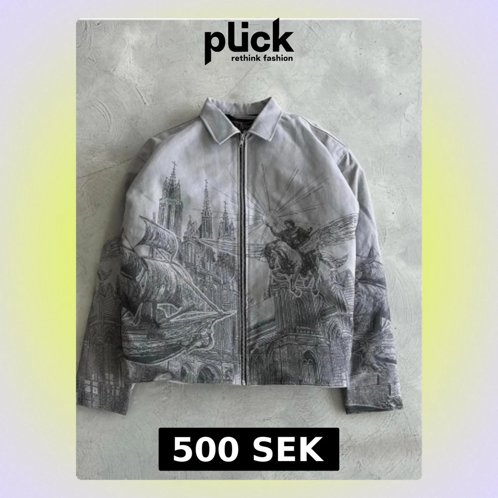 Unik grå bomberjacka med detaljerat grafiskt tryck av byggnader, skepp och en bevingad figur. Jackan har dragkedja framtill, klassisk krage och lång ärm. Perfekt för dig som vill sticka ut med en konstnärlig vibe. Storlek L men passar som en boxy fit M.