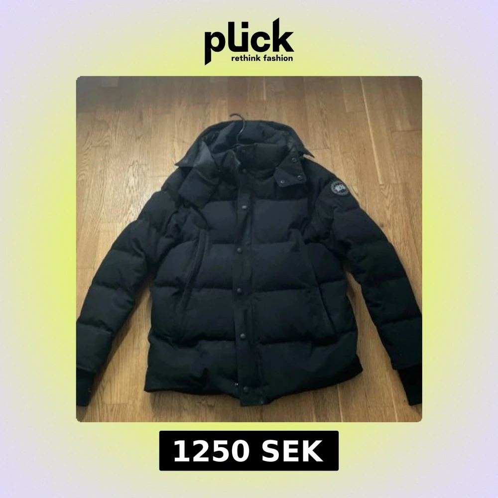 Säljer en svart dunjacka från Canada Goose i storlek L. Jackan har en klassisk pufferstil med huva, ribbade muddar och diskret logotyp på ärmen. Perfekt för kalla dagar och riktigt snygg till streetwear-looken.