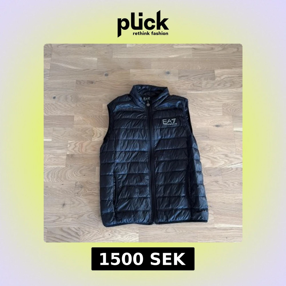 Snygg svart dunväst från EA7 Emporio Armani med quiltad design och hög krage. Västen har dragkedja framtill och logga på bröstet. Perfekt att slänga över en hoodie för en sportig look. Använt väldigt lite. Pris kan diskuteras