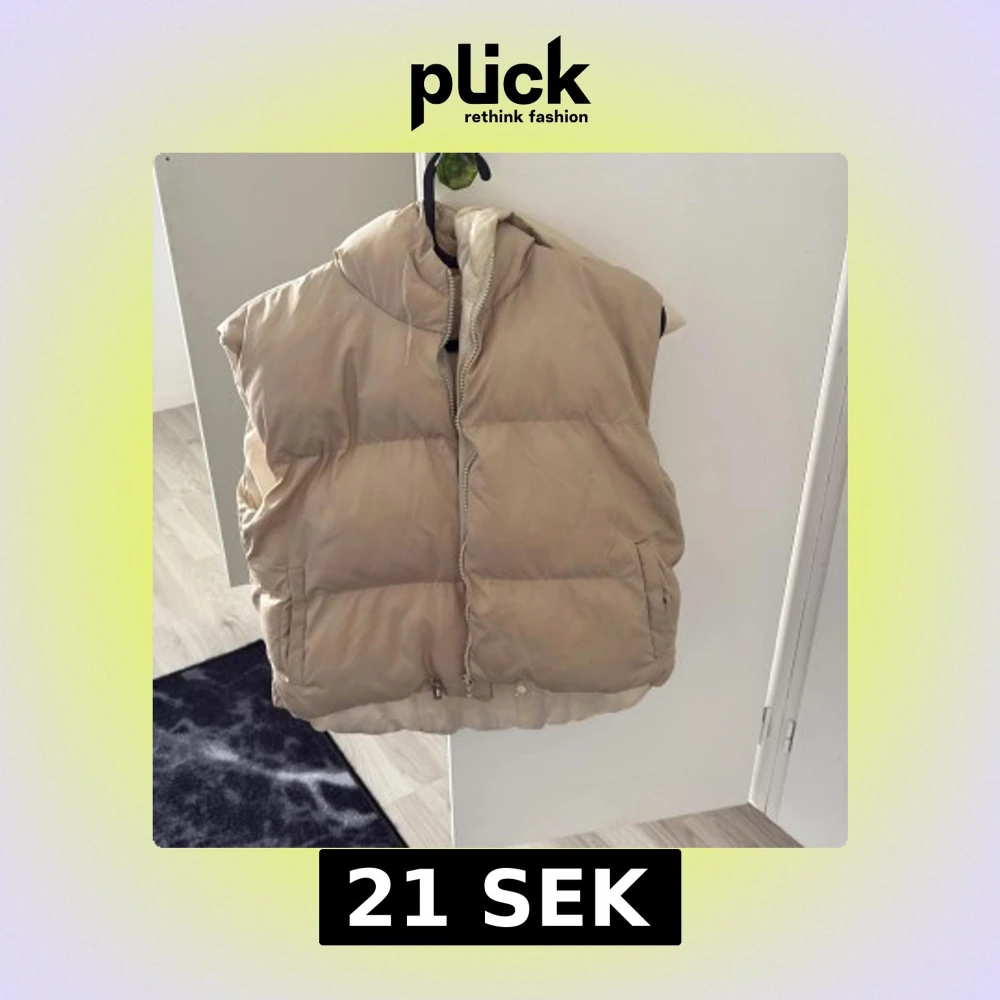 Säljer en beige dunväst med huva och dragkedja framtill. Västen är quiltad och har två fickor på sidorna samt justerbar nederkant. Perfekt för lager-på-lager och chill höst- eller vinterstil.