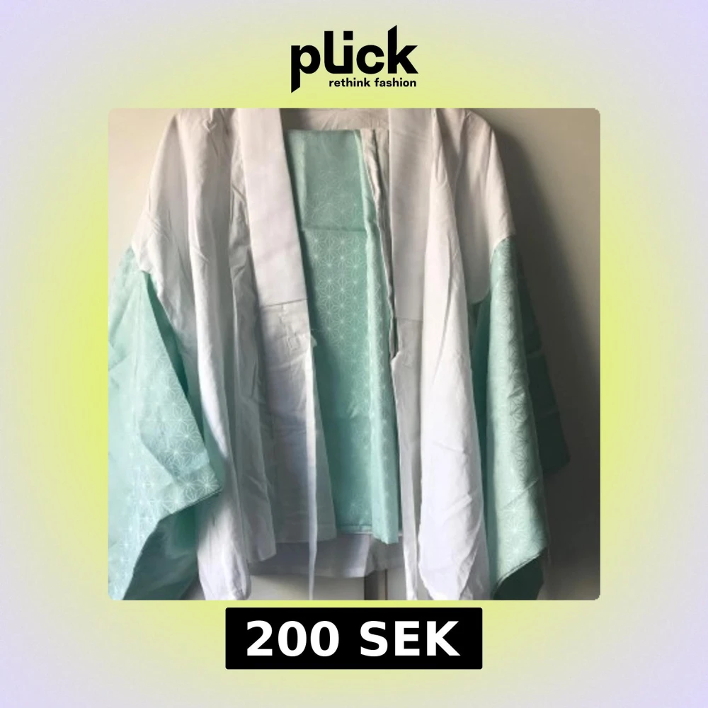 Säljer en elegant kimono i vitt och mintgrönt med ett subtilt geometriskt mönster. Den har vida ärmar och en öppen front med knytband. Perfekt för en stilfull look.